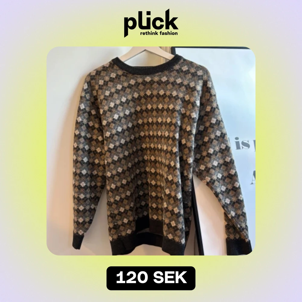 Säljer en mönstrad / rutig tröja från Marks & Spencer. Den är i storlek medium och i 50% merinoull. Den har en liten slitning i halsringningen.