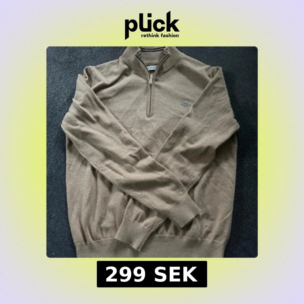 Säljer en beige tröja från GANT med halv dragkedja och broderad logga på bröstet. Tröjan har ribbade muddar och krage med randig detalj på insidan. Perfekt för lager-på-lager och stilren look.