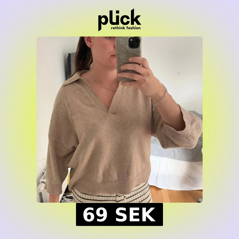 Beige stickad tröja med avslappnad passform och v-ringning. Tröjan har en bred krage och trekvartsärmar, perfekt för lager-på-lager. Ribbstickade muddar vid ärmslut och nederkant ger en snygg detalj.