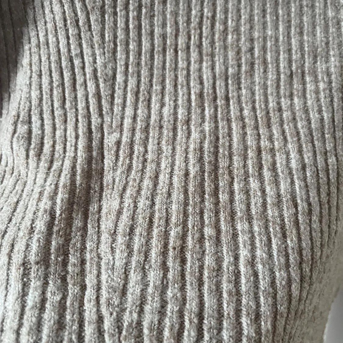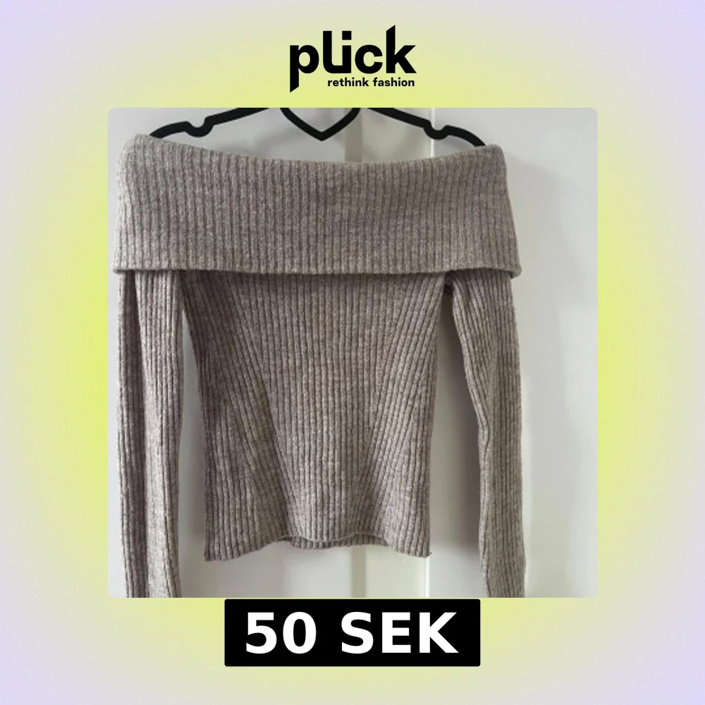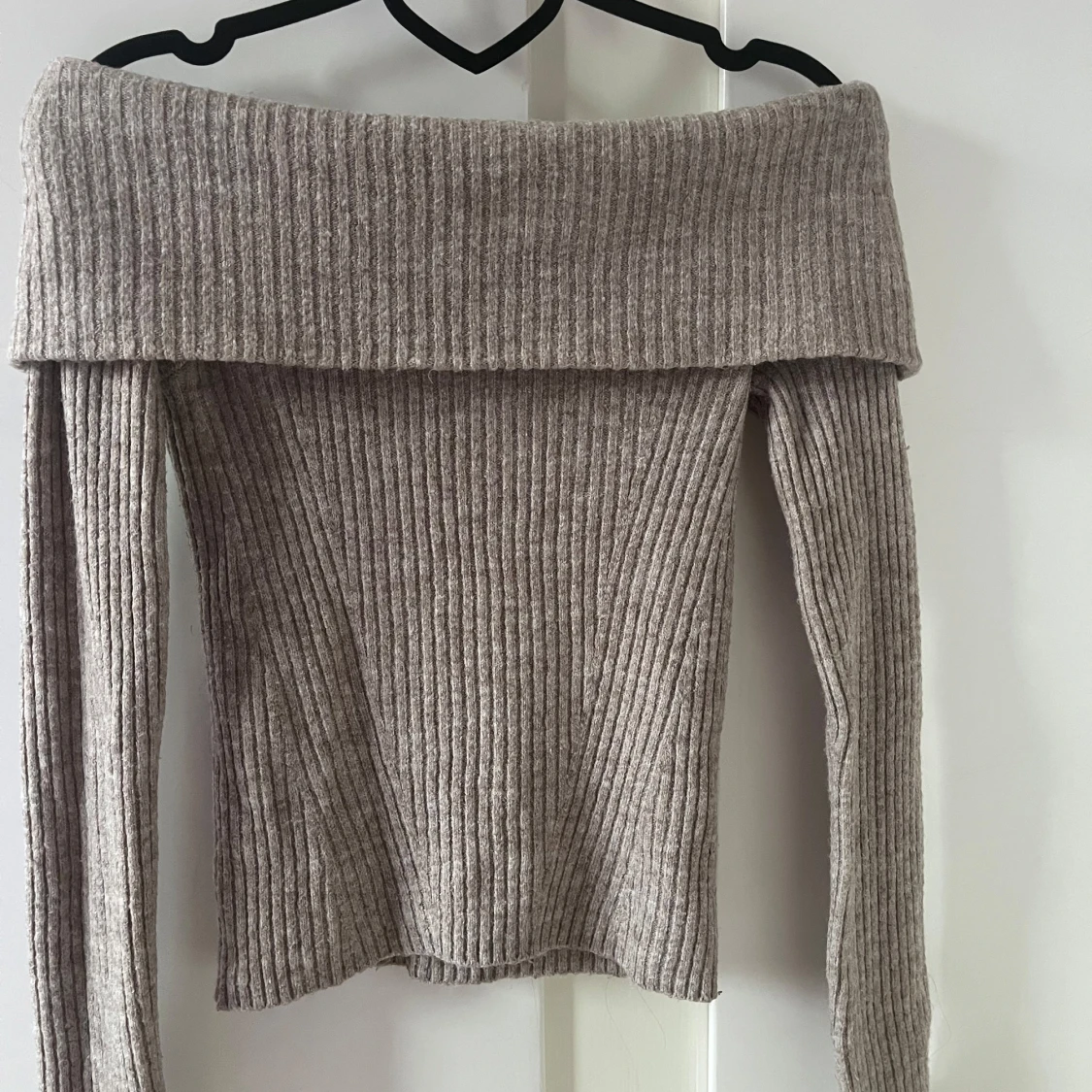 Superfin beige stickad tröja med ribbat mönster och bred offshoulder-krage. Långärmad och mjuk.
