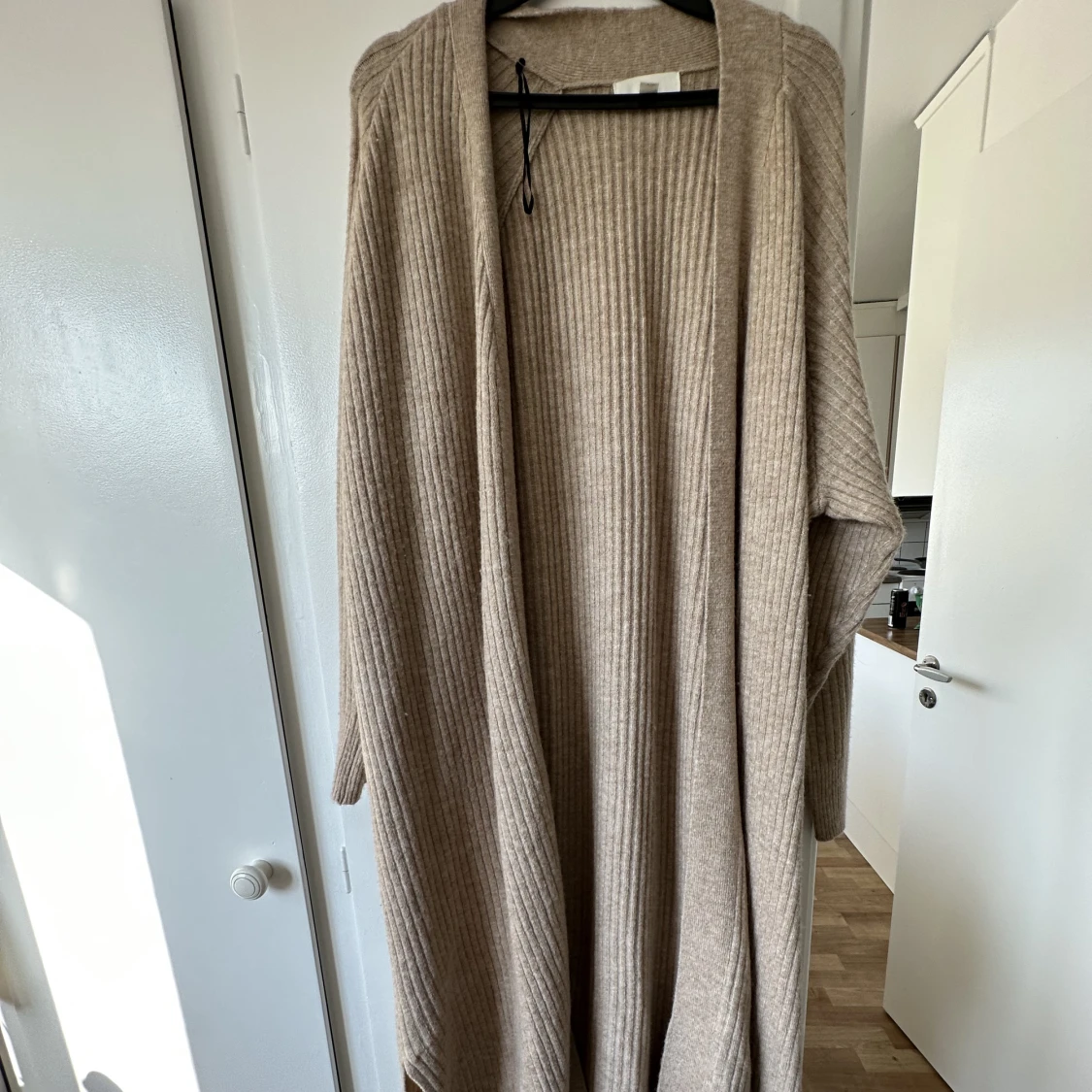Beige kofta, är nedanför knäna på mig som är 170, jätte mysig, delvis ull, använd 2 ggr