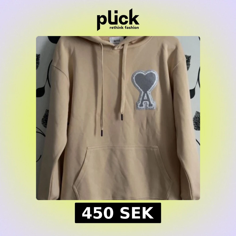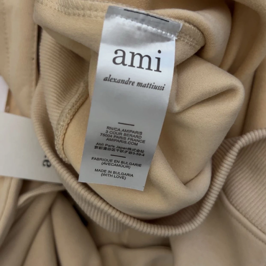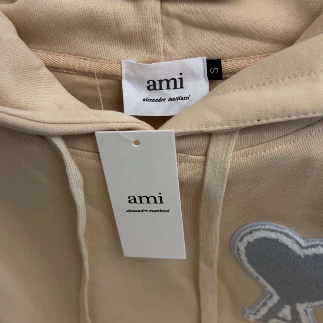 Snygg beige hoodie från Ami Paris med stor grå hjärtdetalj och bokstaven A på bröstet. Tröjan har huva med snörning, magficka och ribbade muddar. Tillverkad i mjuk bomull, perfekt för chill dagar. Stilren och trendig design som sticker ut.