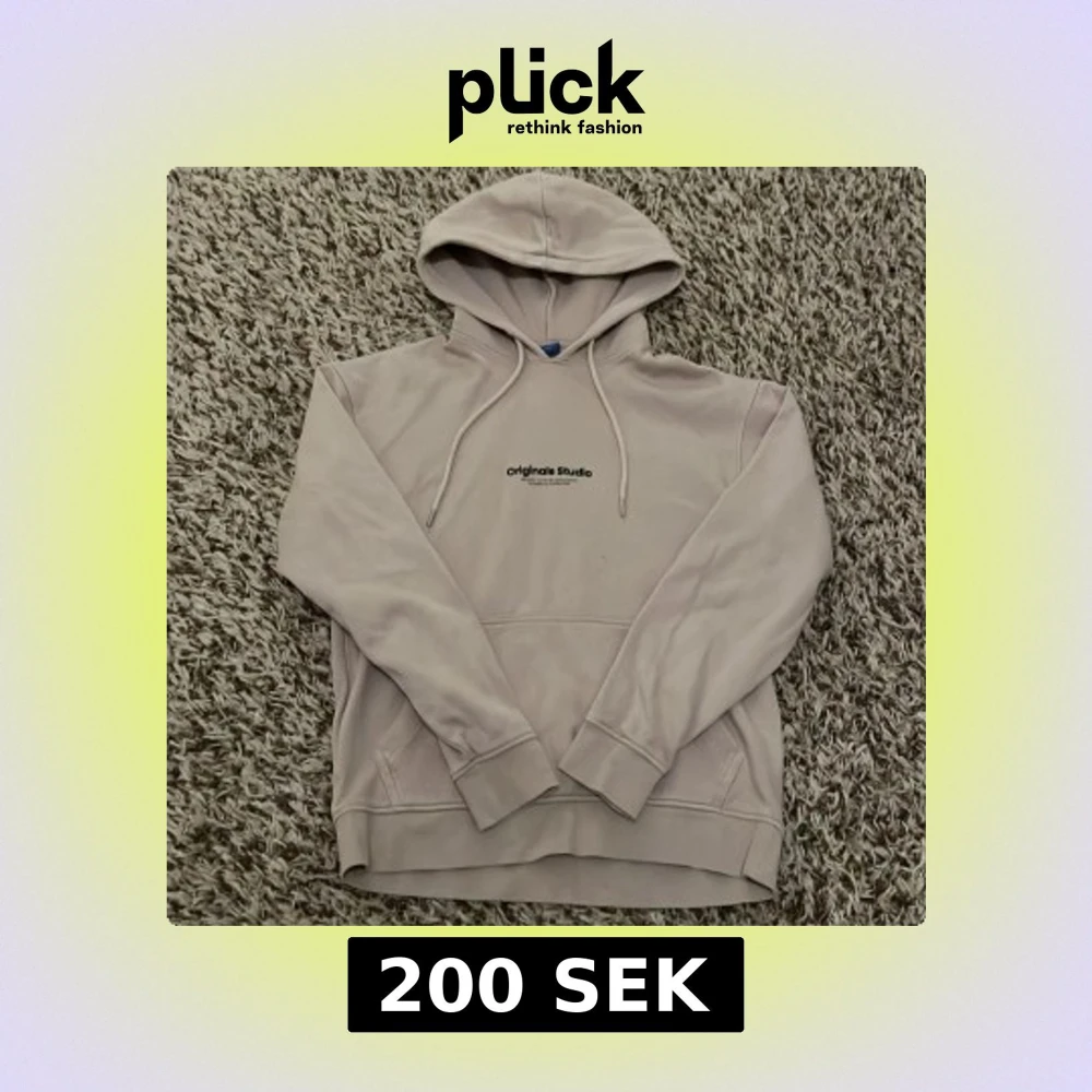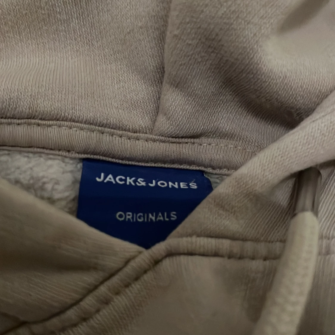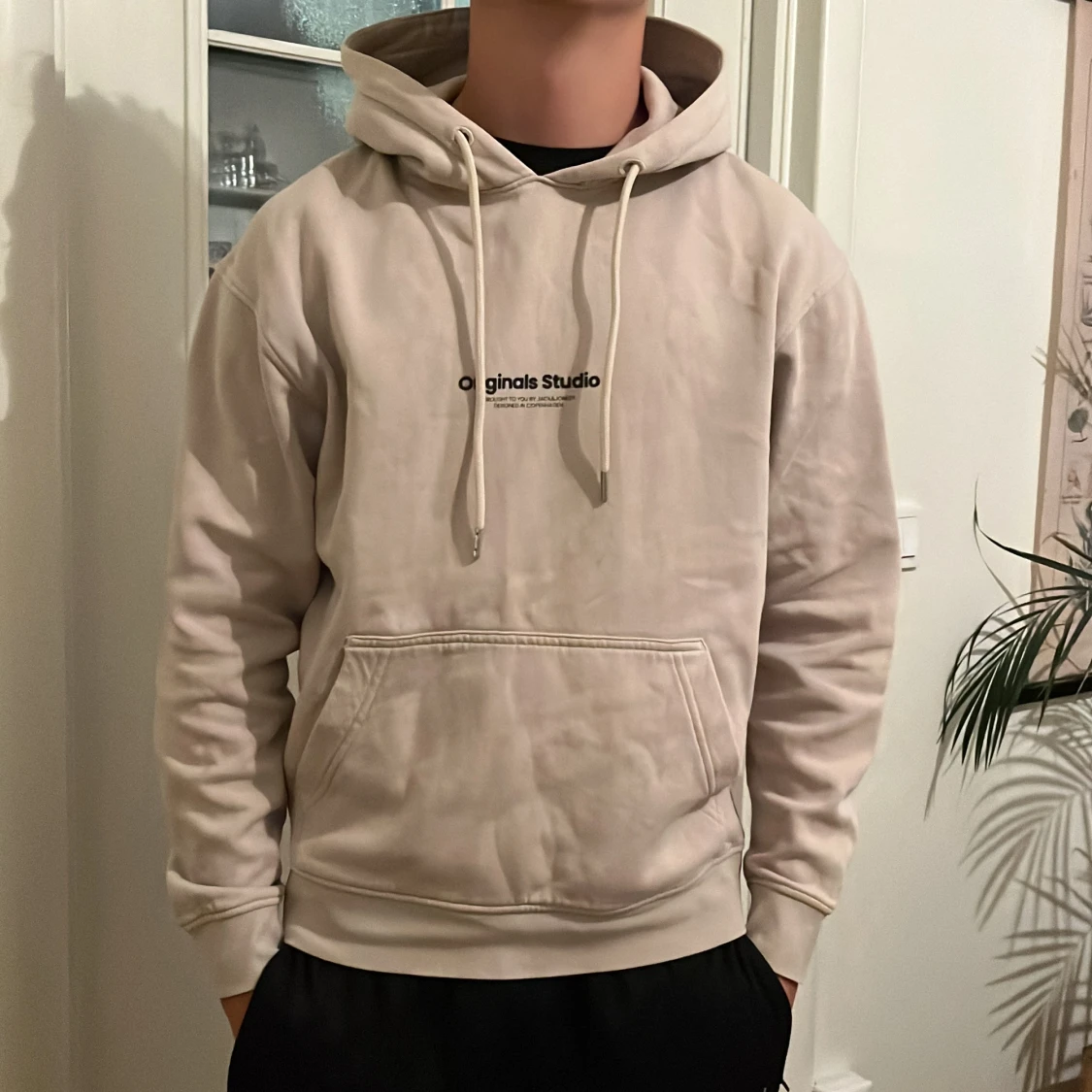 Säljer en stilren beige hoodie från Jack & Jones Originals med svart tryck 'originals Studio' på bröstet. Hoodien har huva med snörning, magficka och ribbade muddar. Perfekt för chill dagar och enkel att matcha med det mesta.