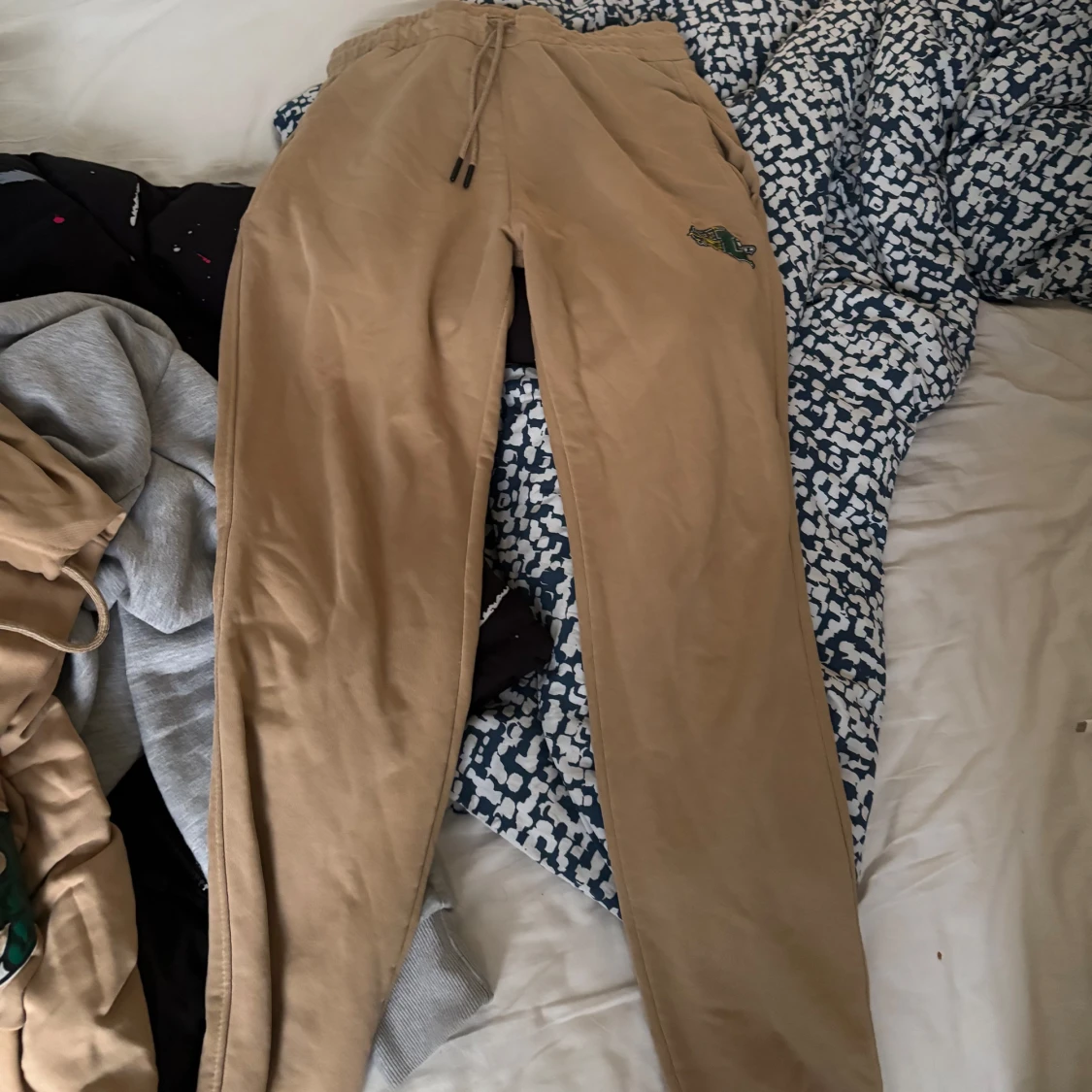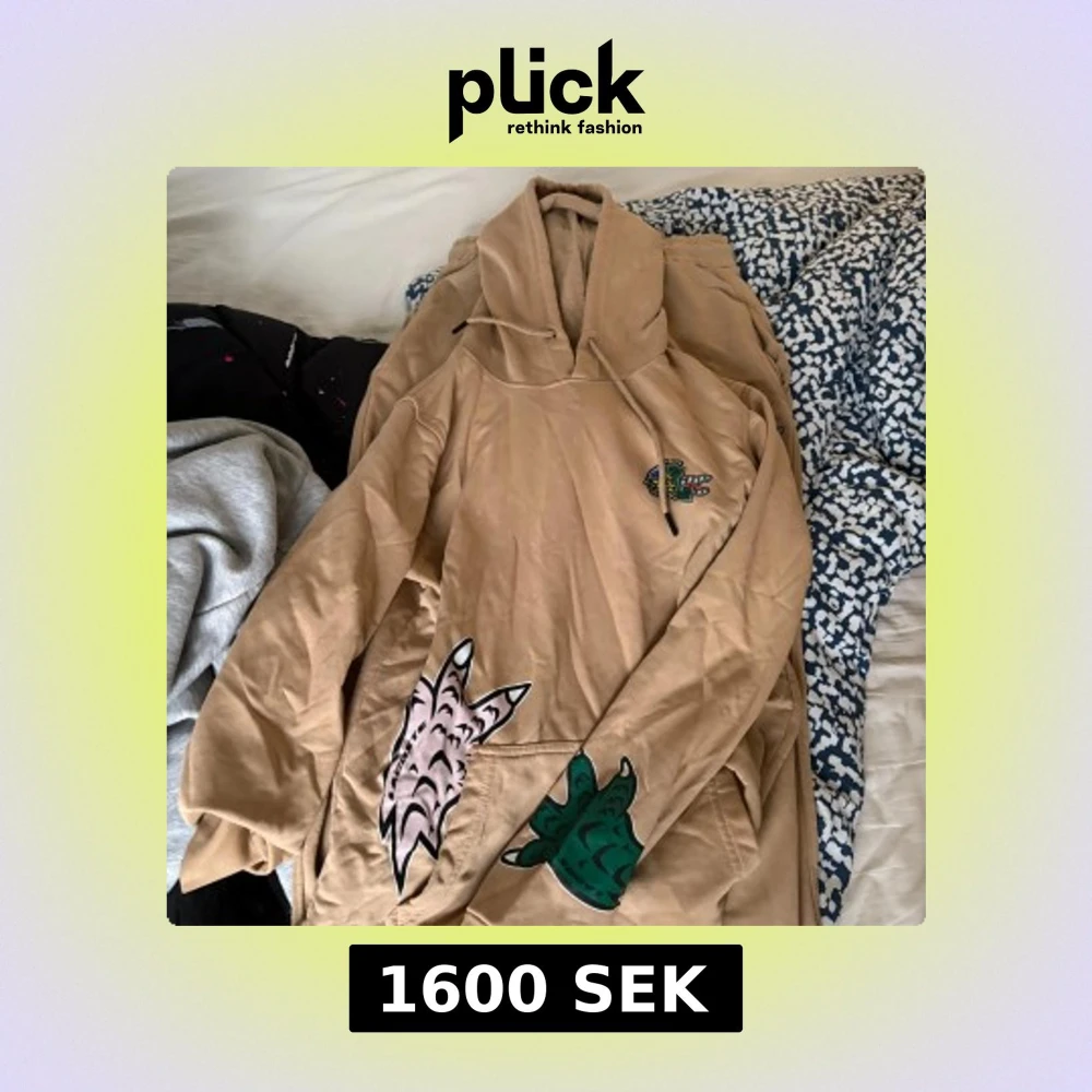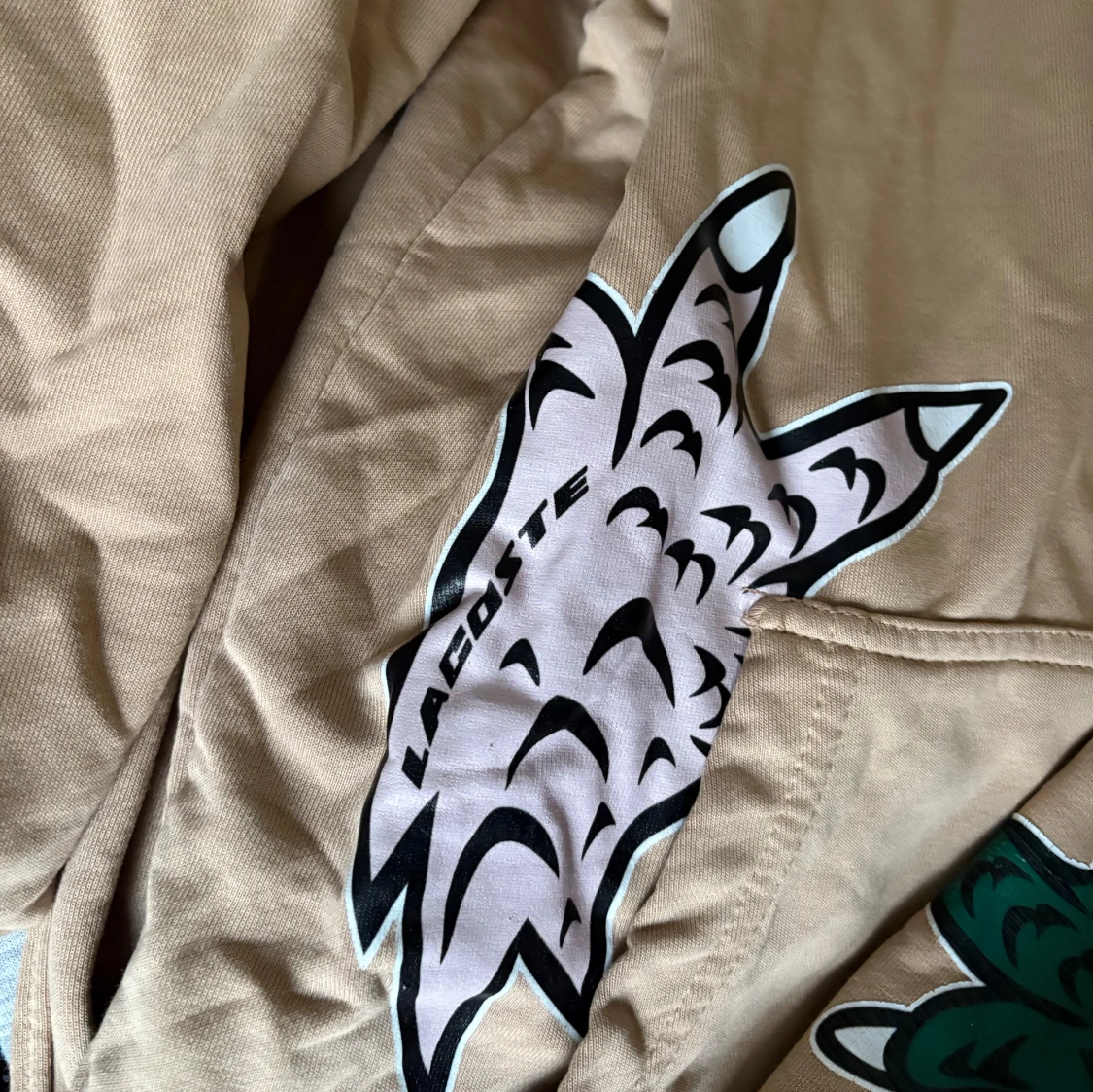 Säljer en beige hoodie från Lacoste med coola tryck av gröna och rosa krokodilklor på framsidan. Tröjan har huva med snörning och en broderad Lacoste-logga på bröstet. Perfekt för dig som gillar streetwear och vill sticka ut lite extra.