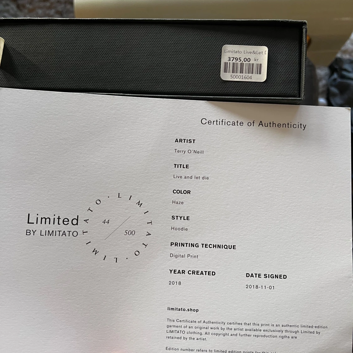 Säljer en exklusiv beige hoodie från Limitato med ett tryck av Terry O'Neill (James Bond) på ryggen. Hoodien har dragkedja och långa ärmar, perfekt för en stilren look. Begränsad upplaga, nummer 44 av 500. Tröjan är i fint skick köpt på NK för 3795 kr. Tröjan är i storlek Small och modellen på bilden är 170 cm.