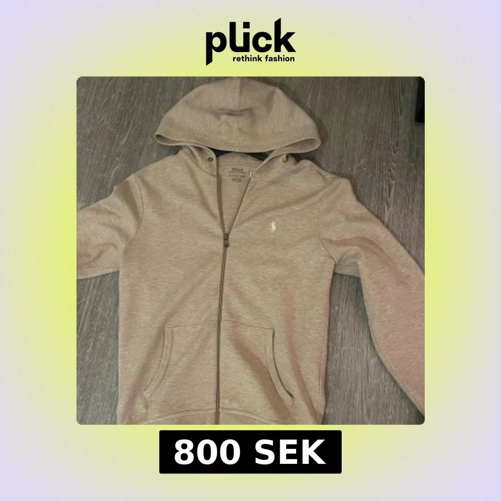 Säljer en beige hoodie från Polo Ralph Lauren med dragkedja och klassisk huva. Tröjan har fickor framtill och den ikoniska vita loggan broderad på bröstet. Perfekt för chill dagar och snygg till jeans eller joggers. Använd fåtal gånger