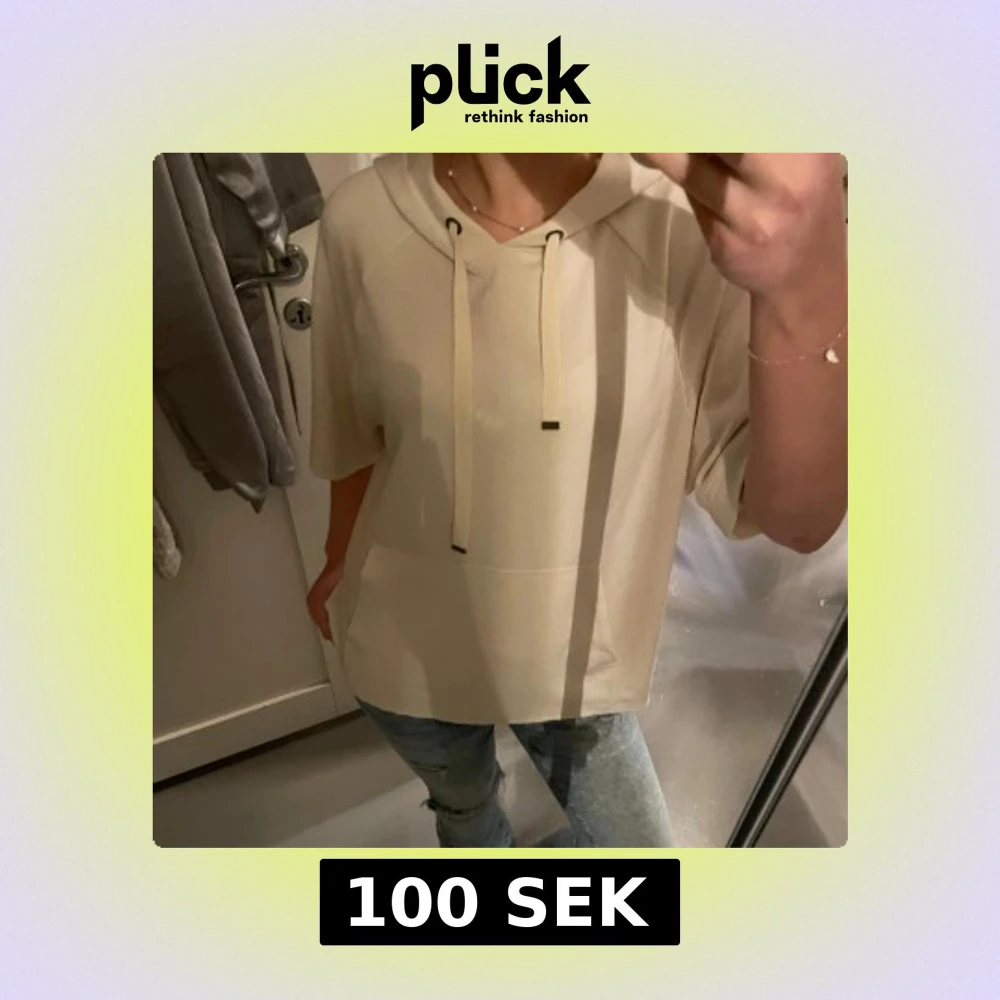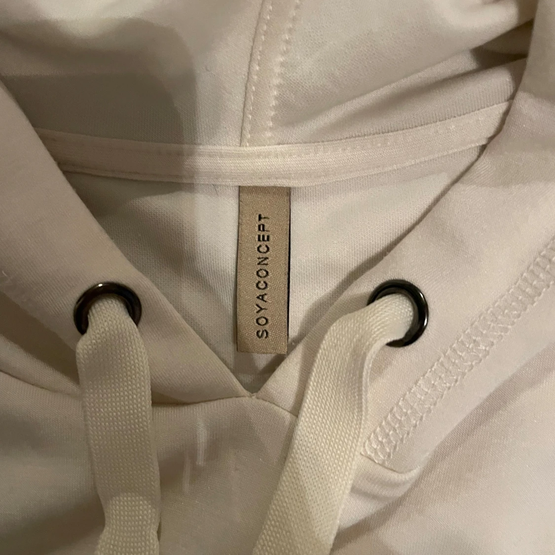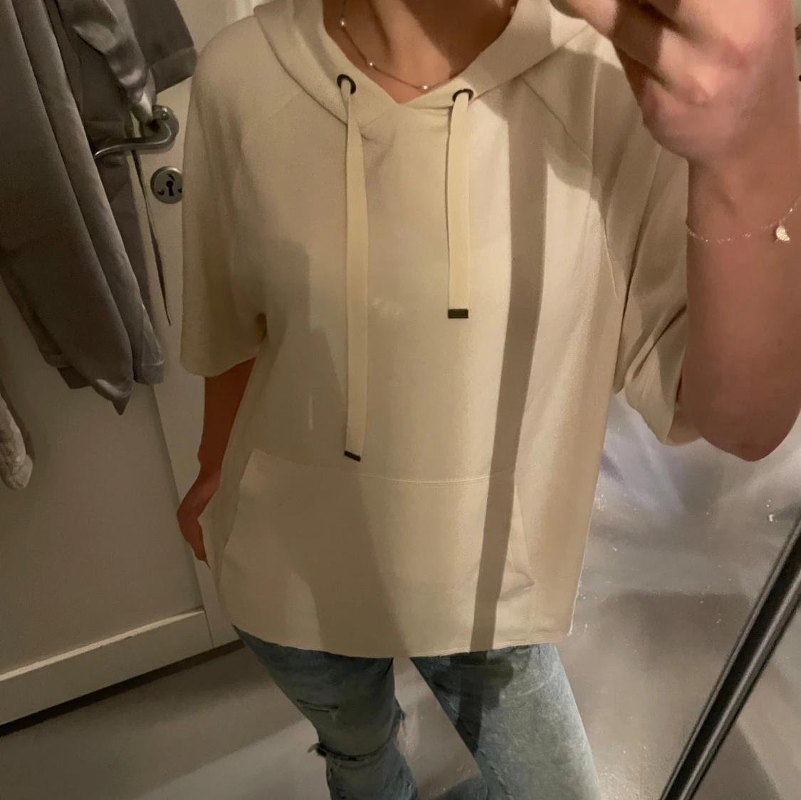 Säljer en beige trekvarts ärmad hoodie från Soyaconcept. Storlek S och avklippt längst ner💗