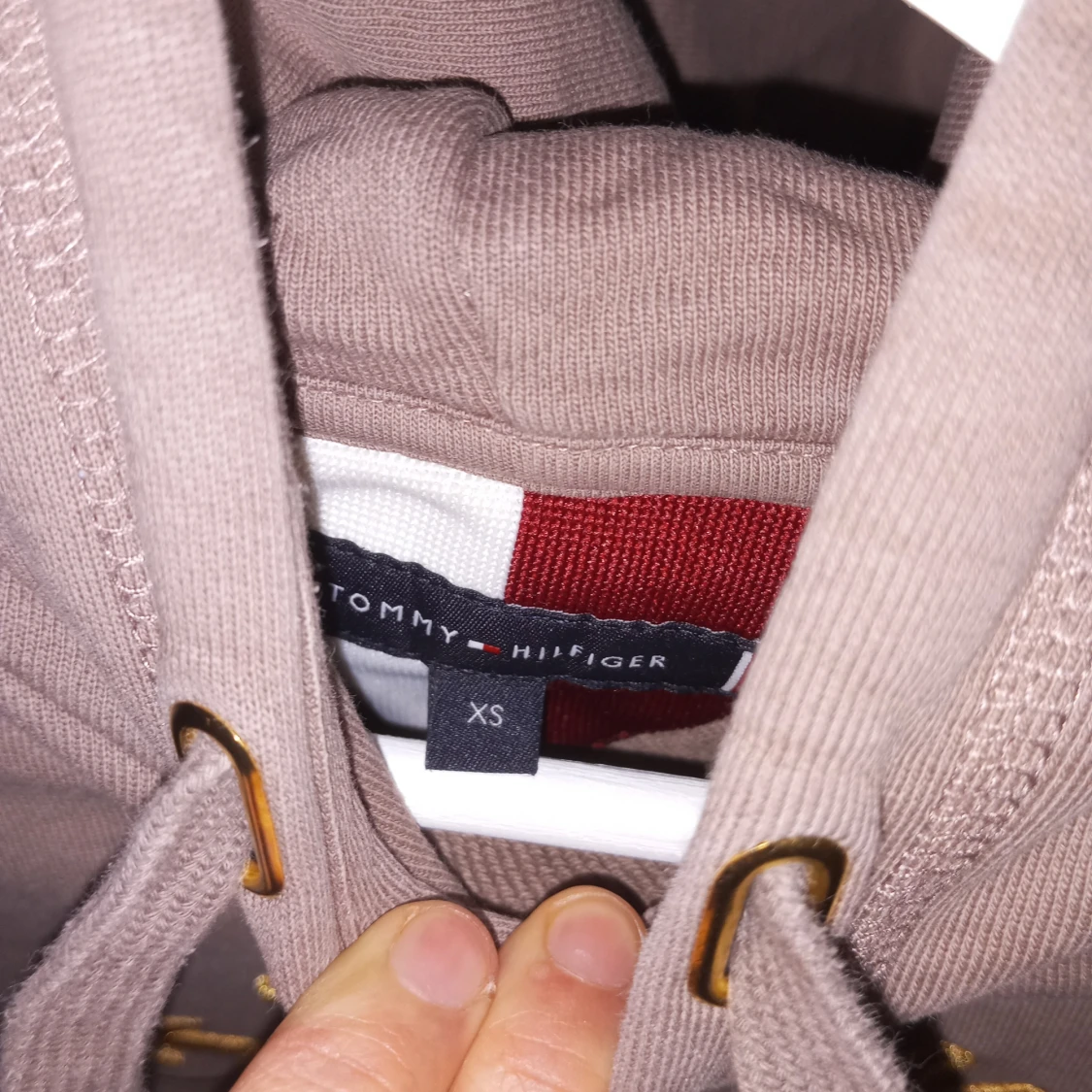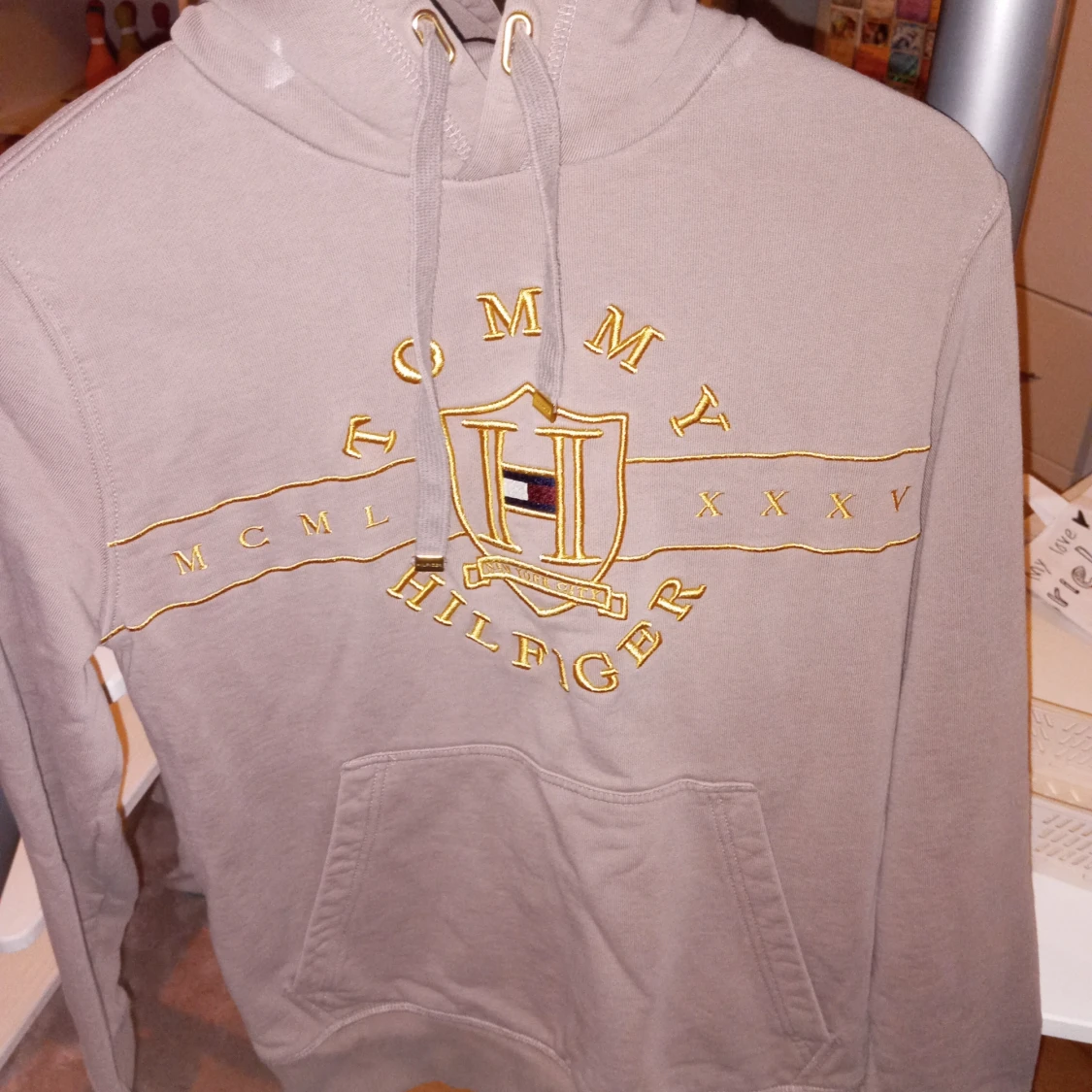 Säljer en snygg beige hoodie från Tommy Hilfiger i storlek XS. Den har en stor logga broderad på framsidan och en praktisk magficka. Perfekt för en avslappnad stil och passar bra till både jeans och joggers. Huvan har justerbara snören för extra komfort. Använd 3 gånger