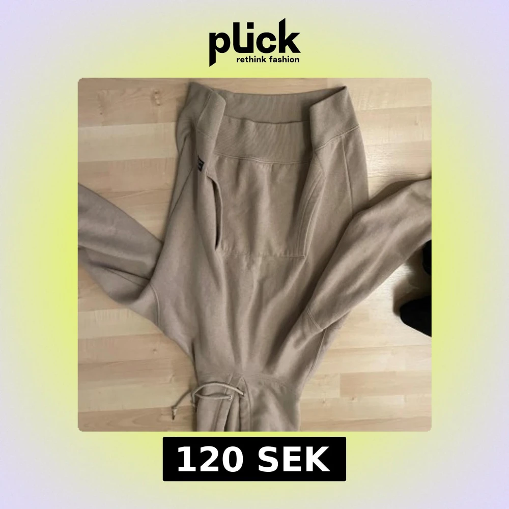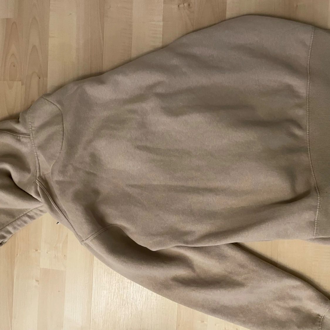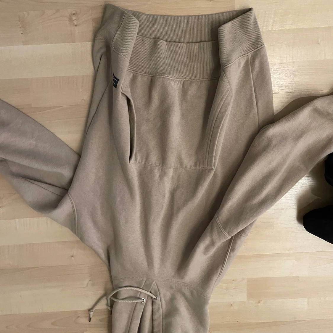 Säljer en beige hoodie med huva och snörning i midjan. Tröjan har långa ärmar, ribbade muddar och en stor ficka framtill. Perfekt för en chill och avslappnad stil.