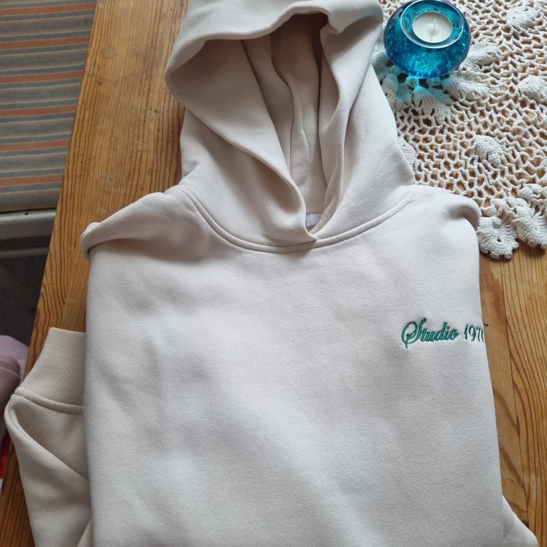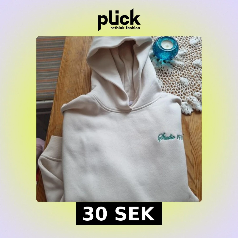 Snygg beige hoodie från Studio 1971 med broderad grön logga på bröstet. Klassisk huva och ribbade muddar. Perfekt för en chill och avslappnad stil.