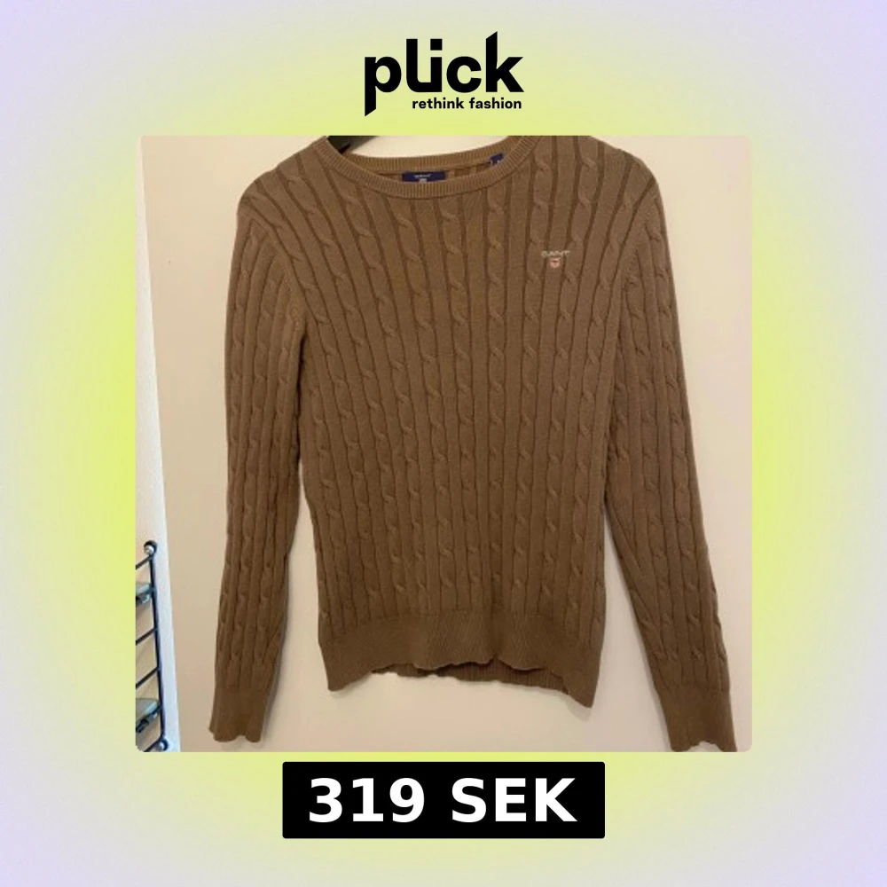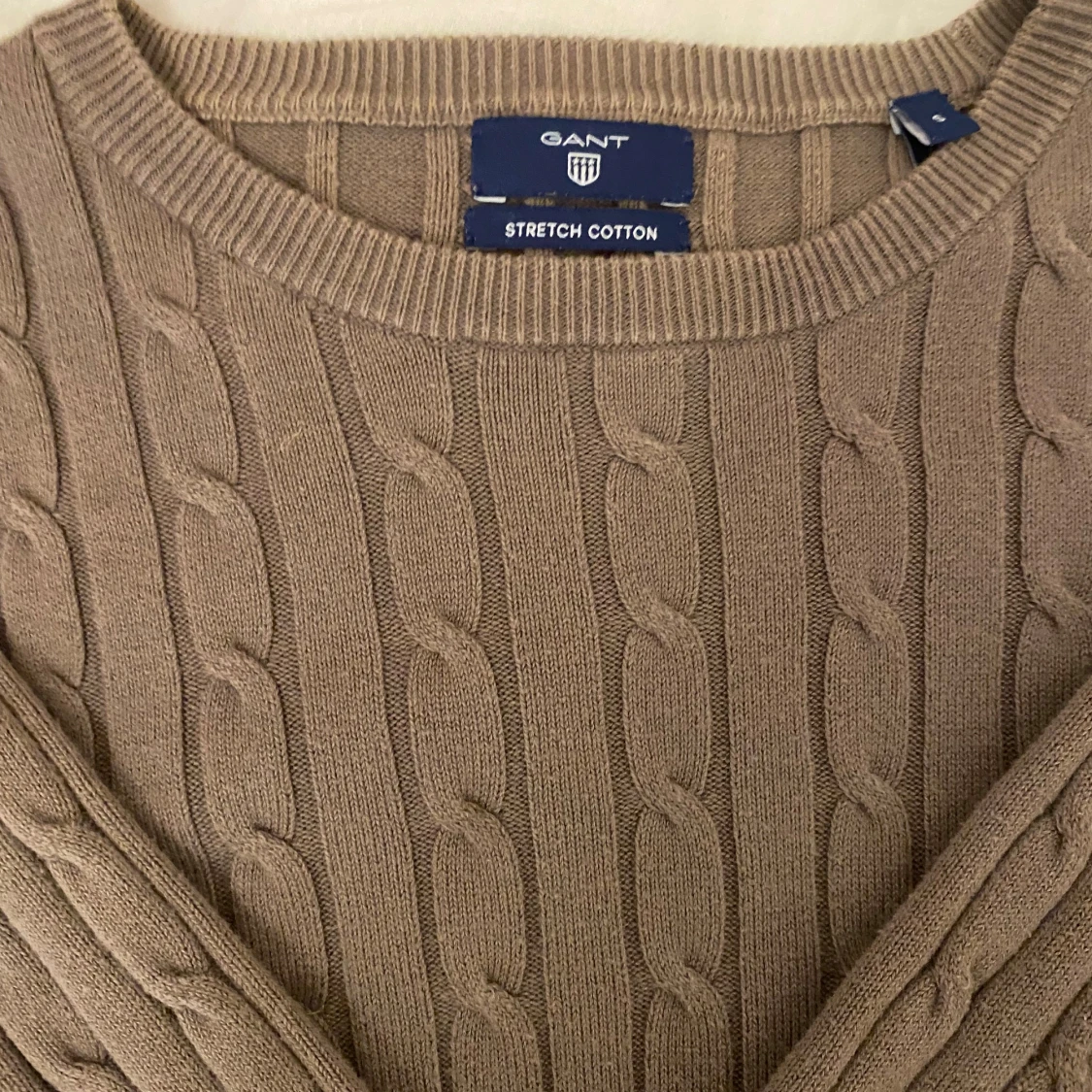 Säljer en beige kabelstickad tröja från GANT i stretchig bomull. Tröjan har rund halsringning, lång ärm och diskret GANT-logga broderad på bröstet. Perfekt för lager-på-lager och snygg till både jeans och kjol.