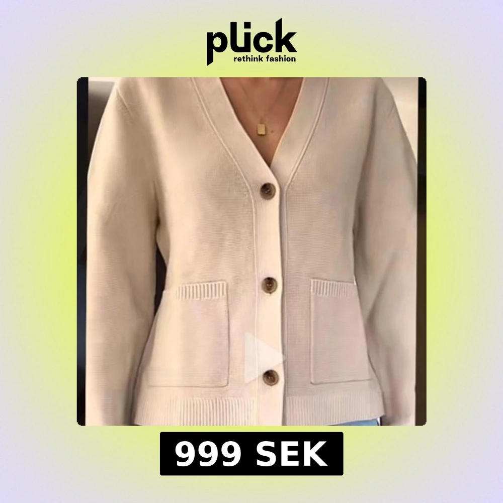 Snygg beige kofta från Arket med v-ringning och tre knappar framtill. Koftan har två stora fickor och ribbade detaljer vid ärmslut och nederkant. Perfekt att slänga över en t-shirt för en chill look. Materialet är mjukt och stickat.