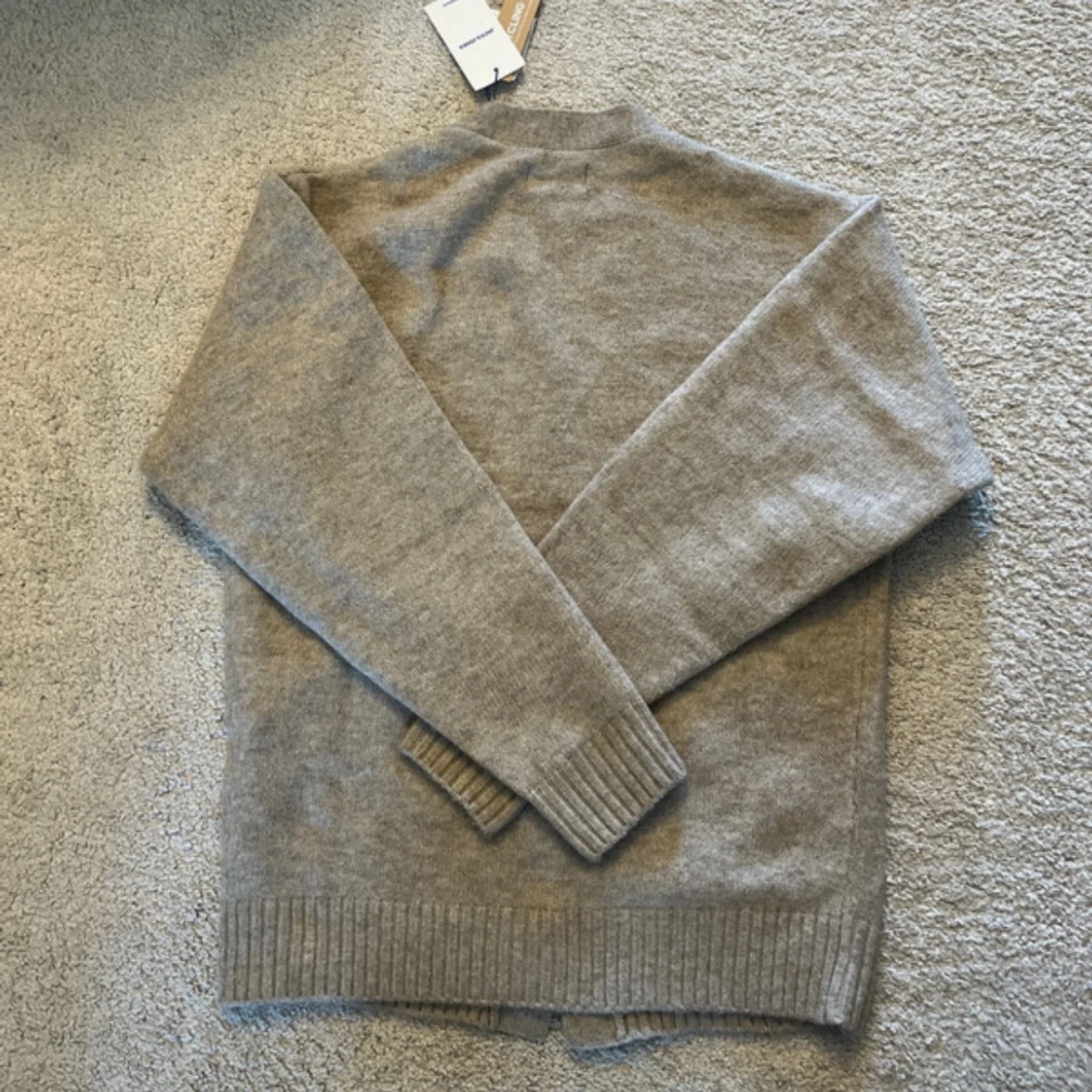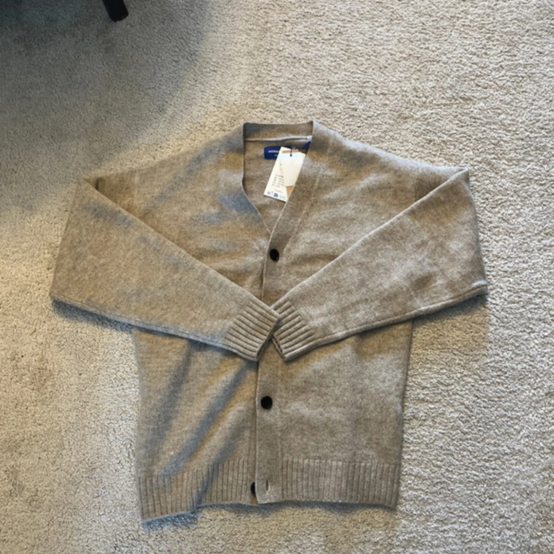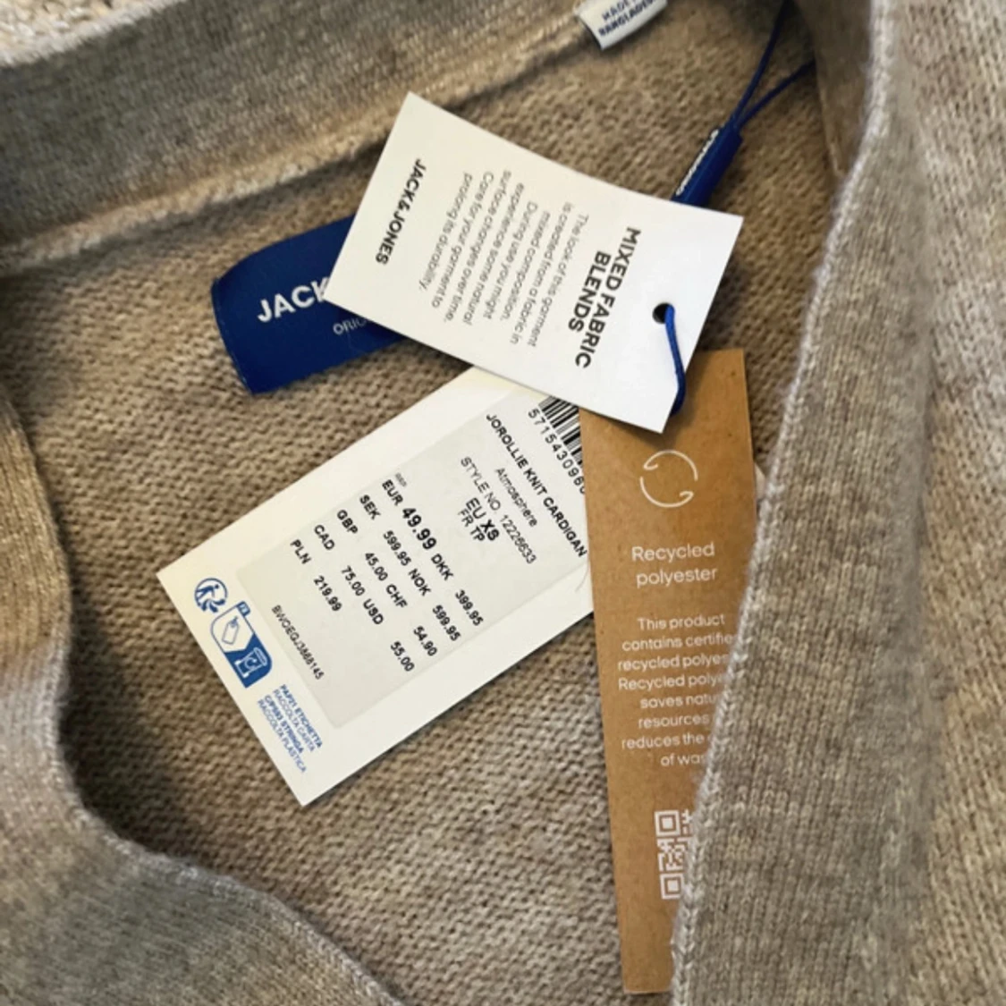 Säljer en stilren beige kofta från Jack & Jones. Koftan är tillverkad i återvunnen polyester och har en v-ringad design med knappar framtill. Perfekt för en avslappnad look.