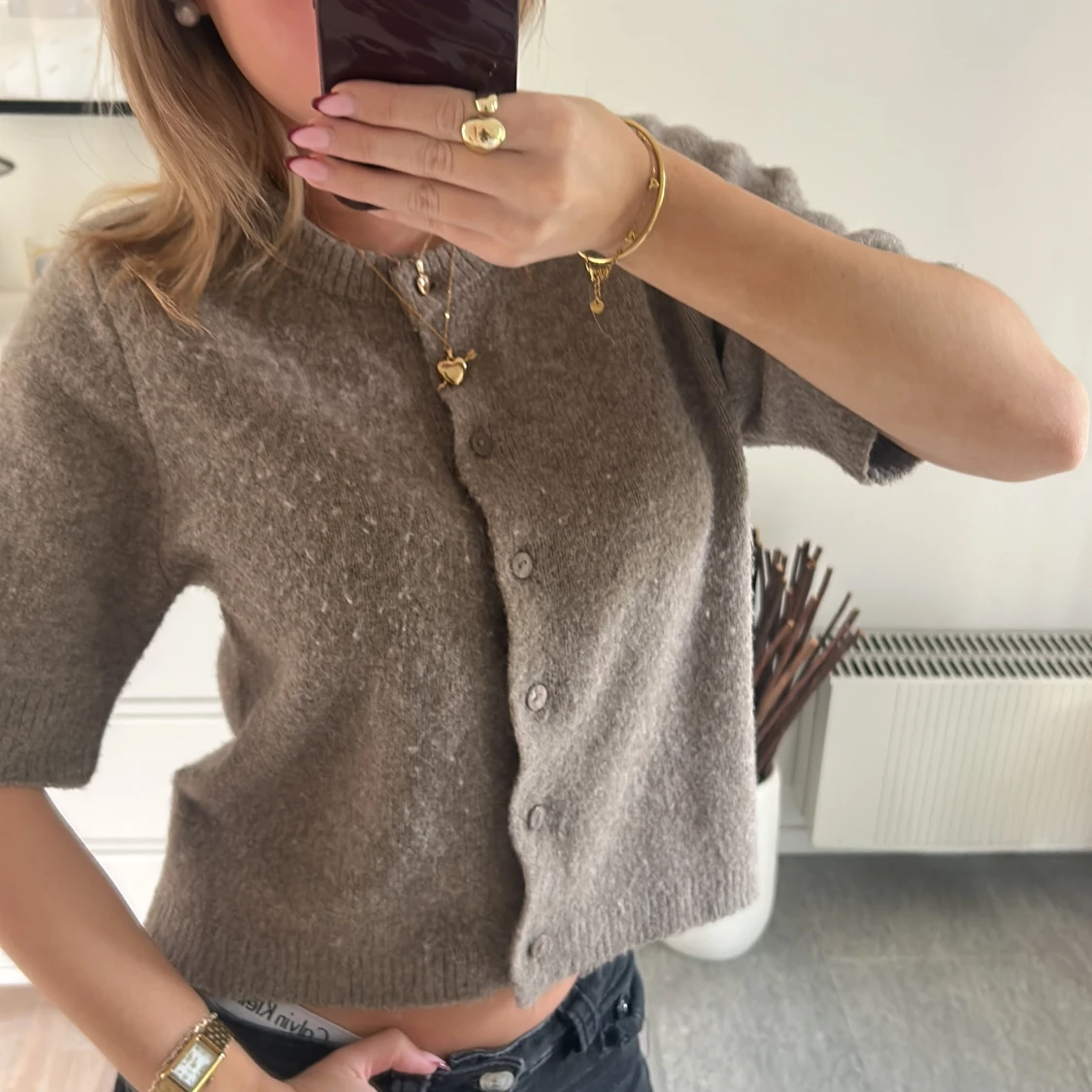 Supermysig beige kofta från Kappahl i stickad ullmix. Kort och boxig modell med knappar framtill och ribbade kanter. Perfekt att slänga över ett linne eller t-shirt för en chill look.
