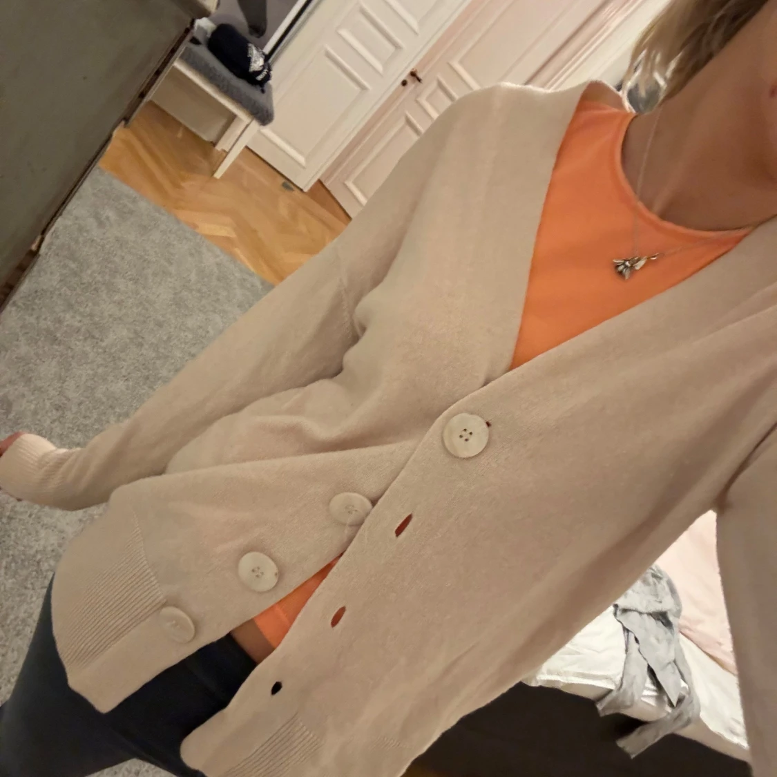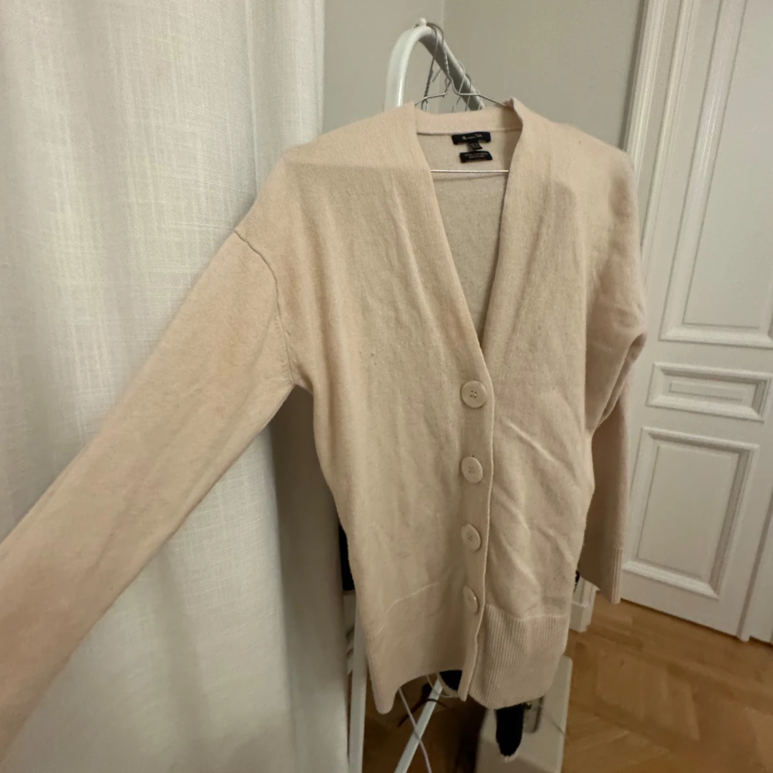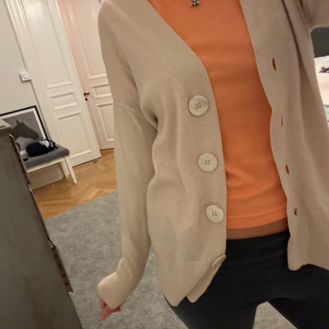 Säljer en supermysig beige kofta från Massimo Dutti . Den har stora knappar framtill och är perfekt för både vardag och mysiga middagar. Den är långärmad och har en normal passform. I en kashmir och ull mix