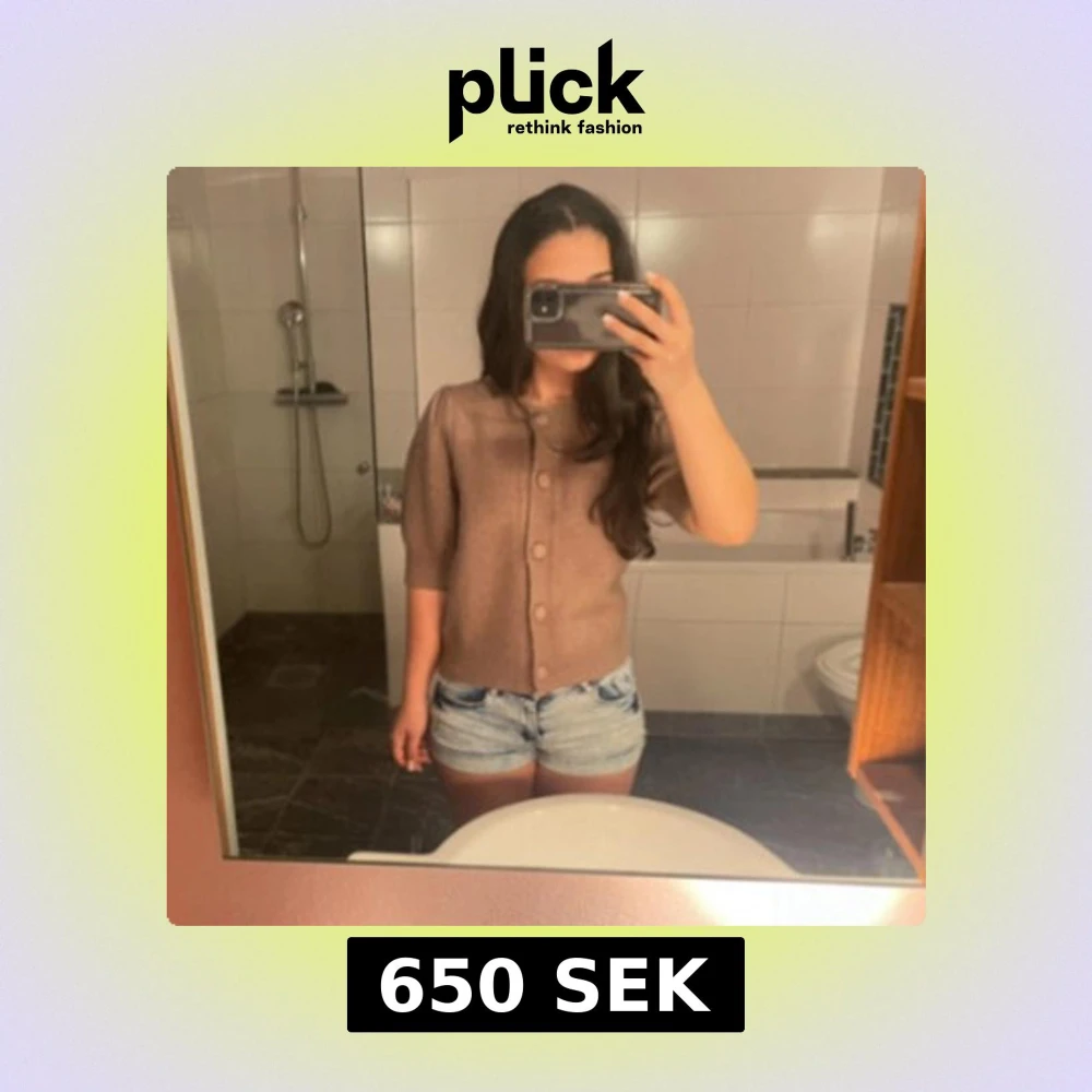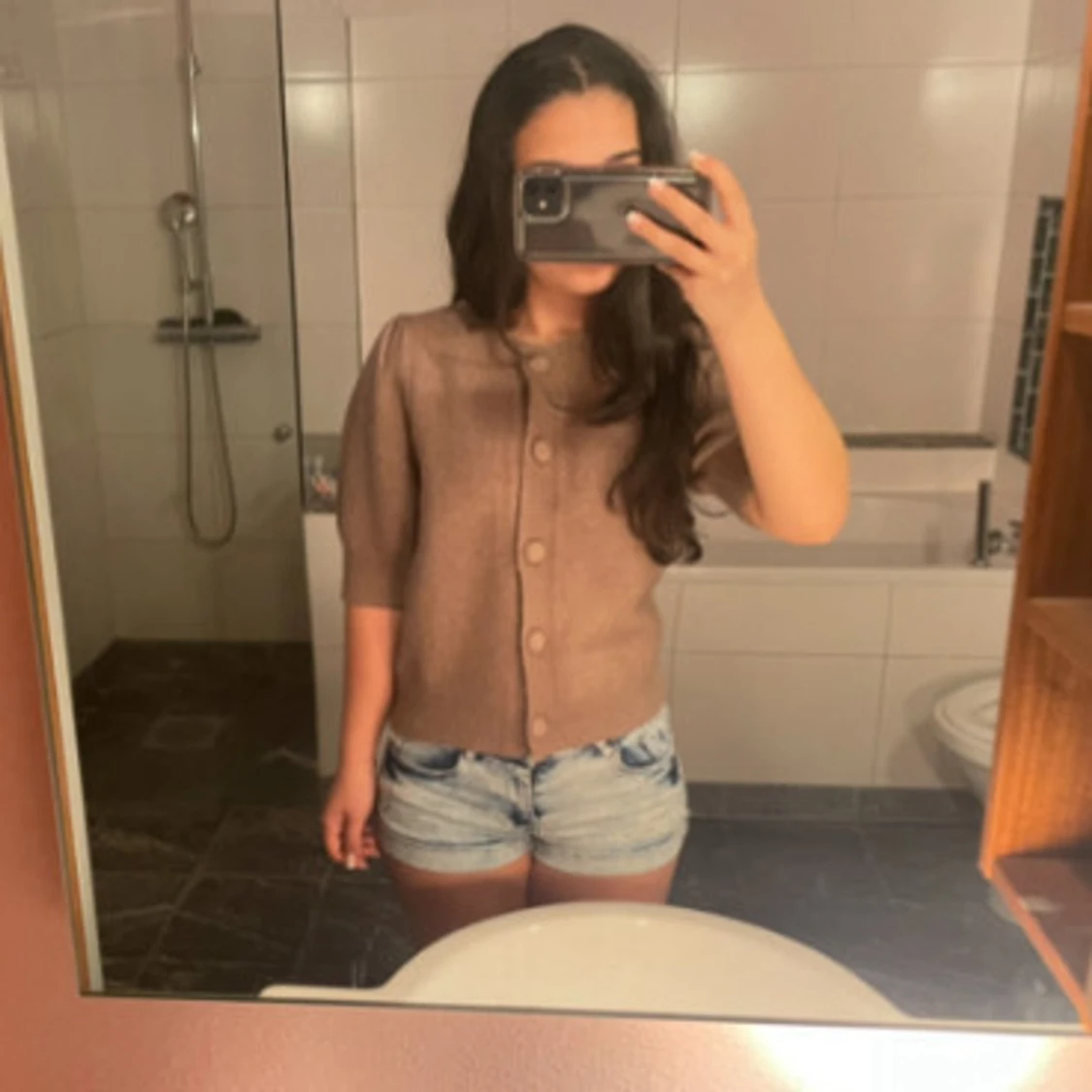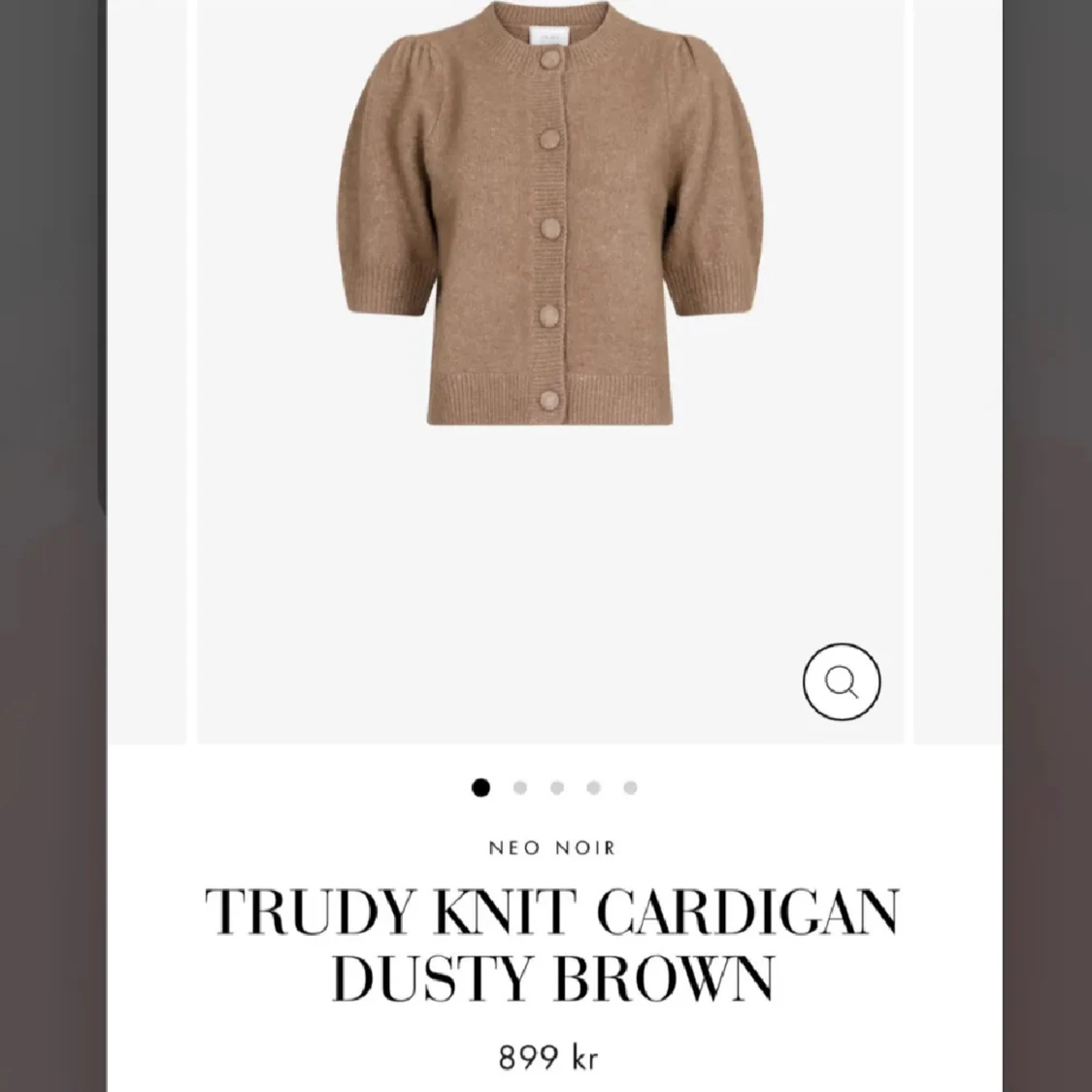 Superfin beige stickad kofta från Neo Noir med rund hals, stora knappar framtill och korta puffärmar. Perfekt att slänga över en topp för en chill och snygg look. Modellen heter Trudy Knit Cardigan Dusty Brown.