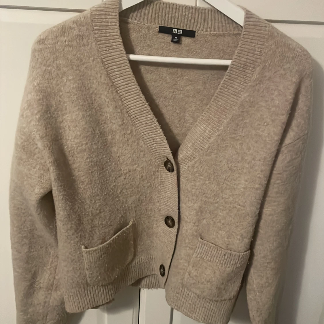 Mysig beige kofta från Uniqlo i storlek XS. Koftan har v-ringning, stora knappar framtill och två praktiska fickor. Den är stickad och har ribbade muddar vid ärmslut och nederkant. Perfekt för lager-på-lager under kyliga dagar. Ny pris 449kr! Perfekt nj till hösten 🍁🍁