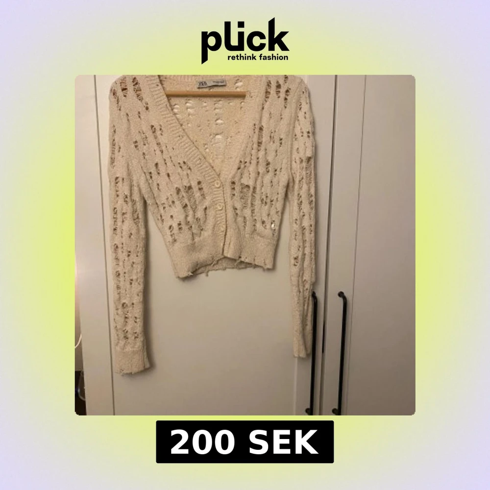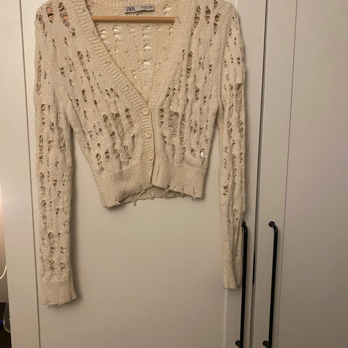 Säljer en beige kofta från Zara med ett hålmönster. Koftan har en v-ringad design och knappar framtill.