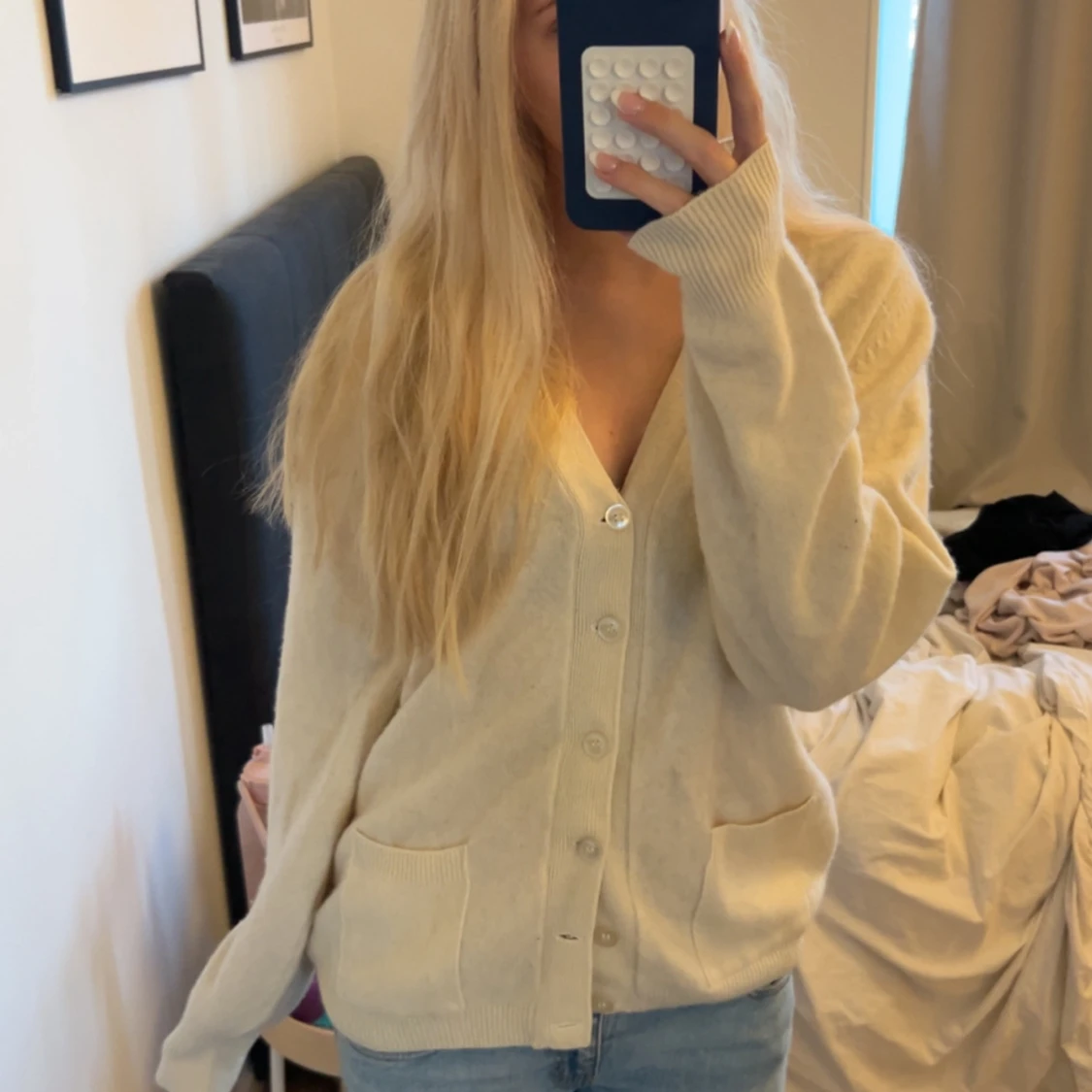 Mysig oversized beige kofta med v-ringning och stora silvriga knappar framtill. Koftan har två praktiska fickor och ribbade muddar vid ärmslut och nederkant. Passar perfekt till jeans och har en loose fit som ger en chill vibe. Står ingen storlek, men skulle uppskatta till en M/L