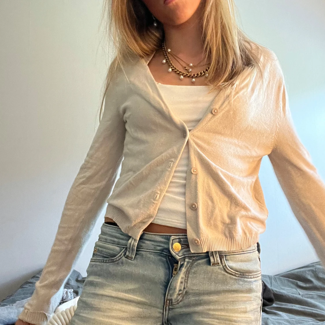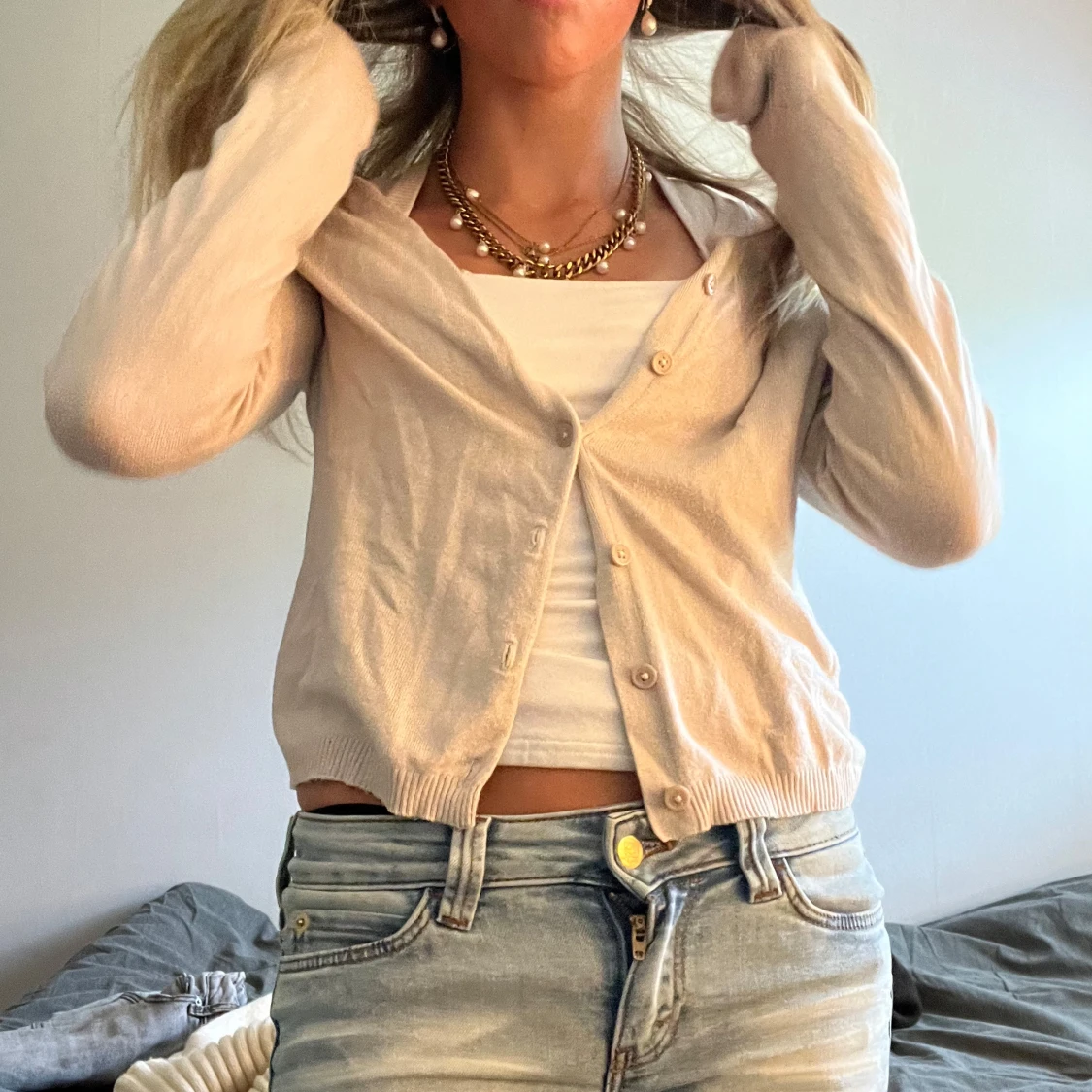 Säljer en tunn och mjuk beige kofta med långa ärmar och knappar framtill. Koftan är lätt att matcha. Använd 1 gång, då inga defekter eller slitage på den❤️
