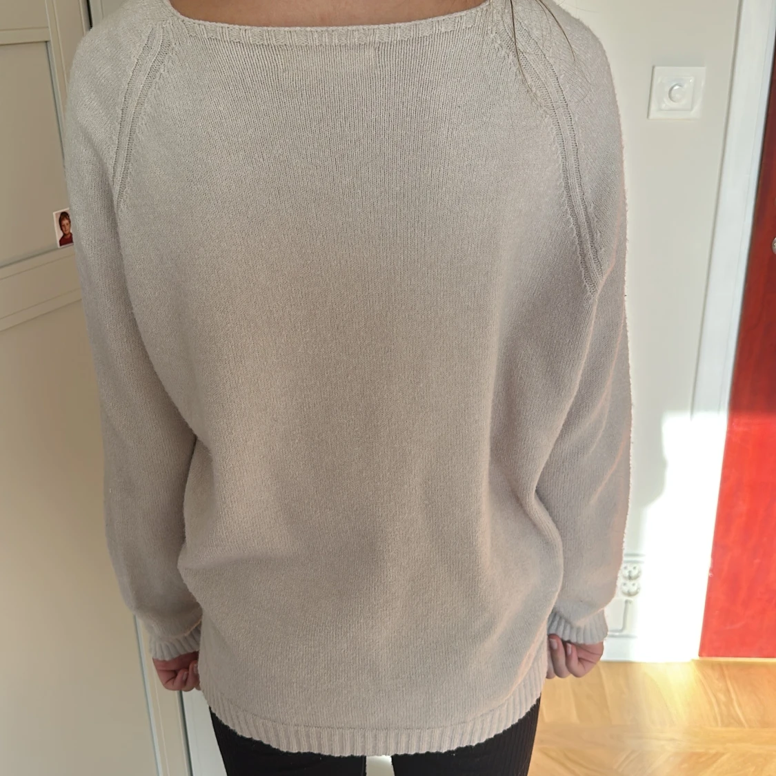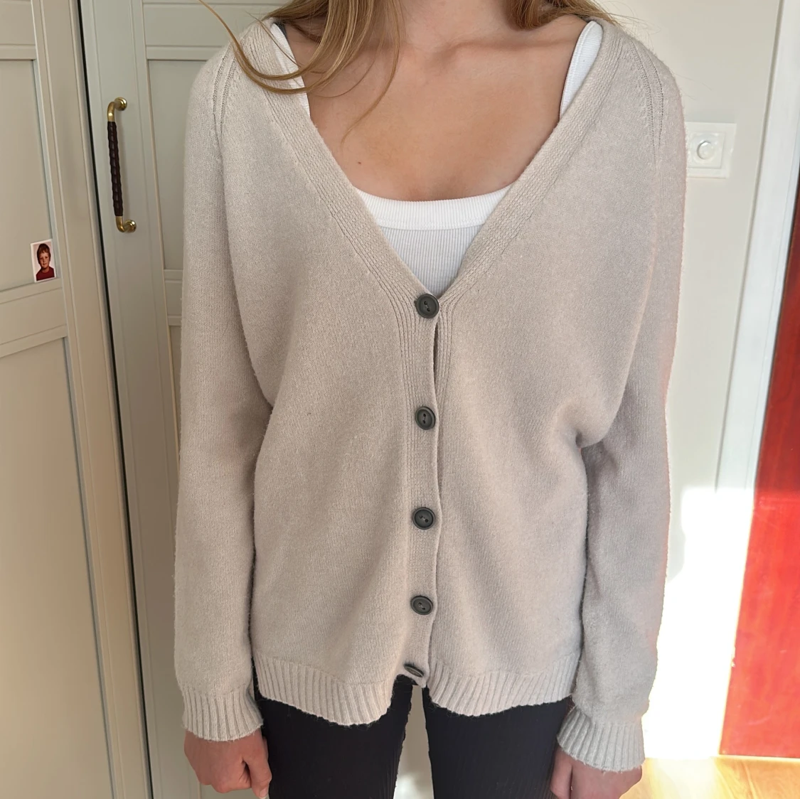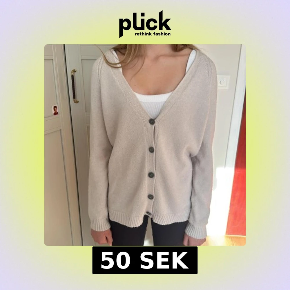 Mysig beige kofta med djup v-ringning och fyra stora knappar framtill. Långärmad modell med ribbade muddar och nederkant. Perfekt att slänga över ett linne eller t-shirt för en chill och stilren look.