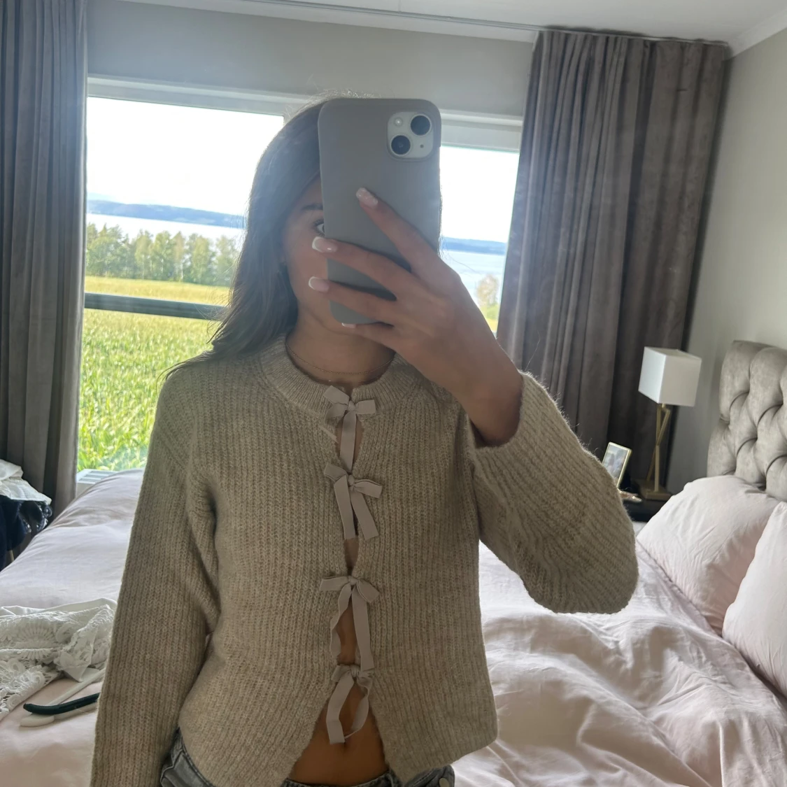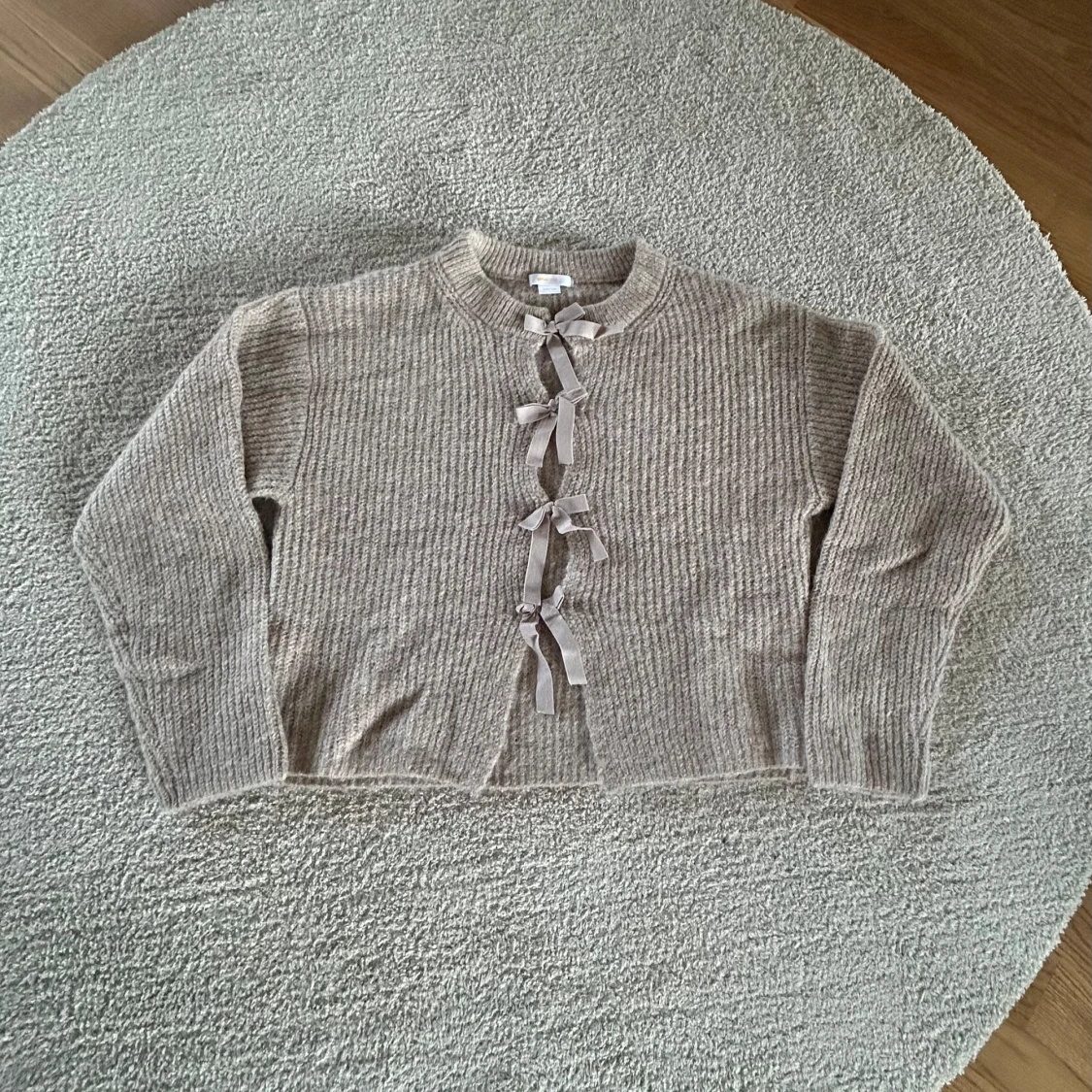 Superfin beige stickad kofta från Gina Tricot med långa ärmar och fyra söta rosetter framtill istället för knappar💕 Koftan är ribbstickad och har en rund halsringning. Perfekt för lager-på-lager under höst och vinter💕använd få tal gånger, hör av dig om det skulle vara något💕