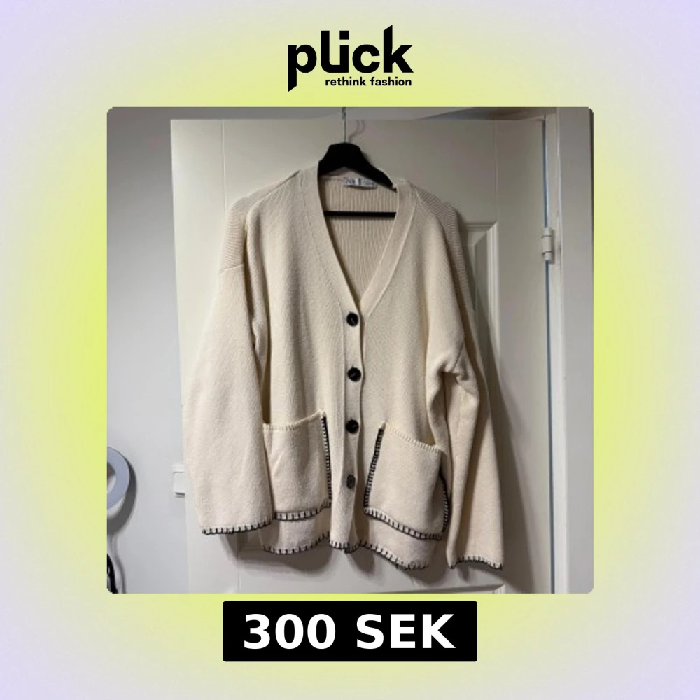 Säljer en stilren beige kofta från Zara med svarta knappar och två stora fickor framtill. Koftan har långa ärmar och en ribbad kantdetalj vid ärmslut och nederkant. Perfekt för en avslappnad look.