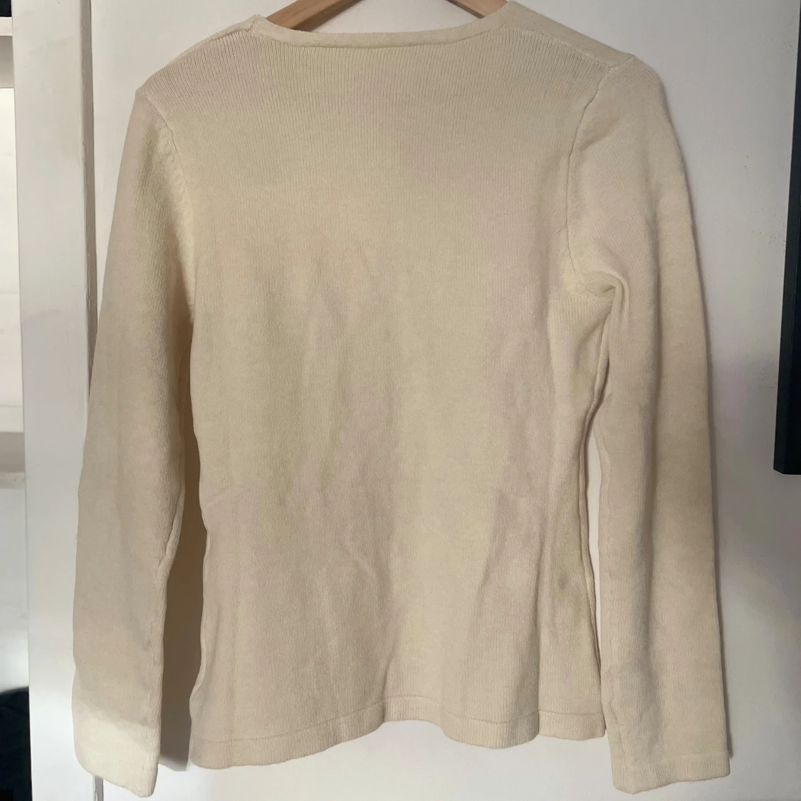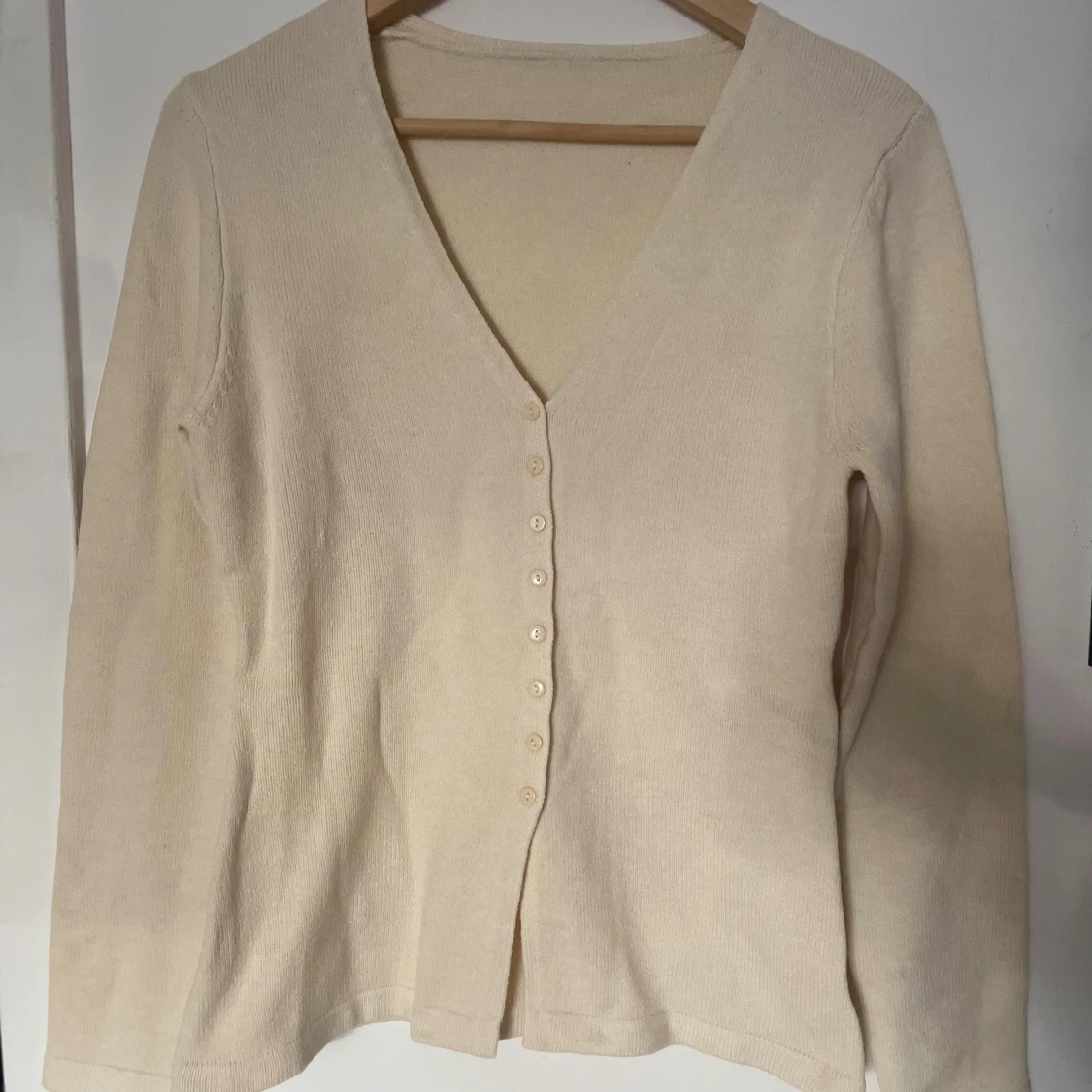 En stilren beige kofta med v-ringad hals och knäppning framtill. Koftan har långa ärmar och är tillverkad i ett mjukt, stickat material som känns skönt mot huden💛