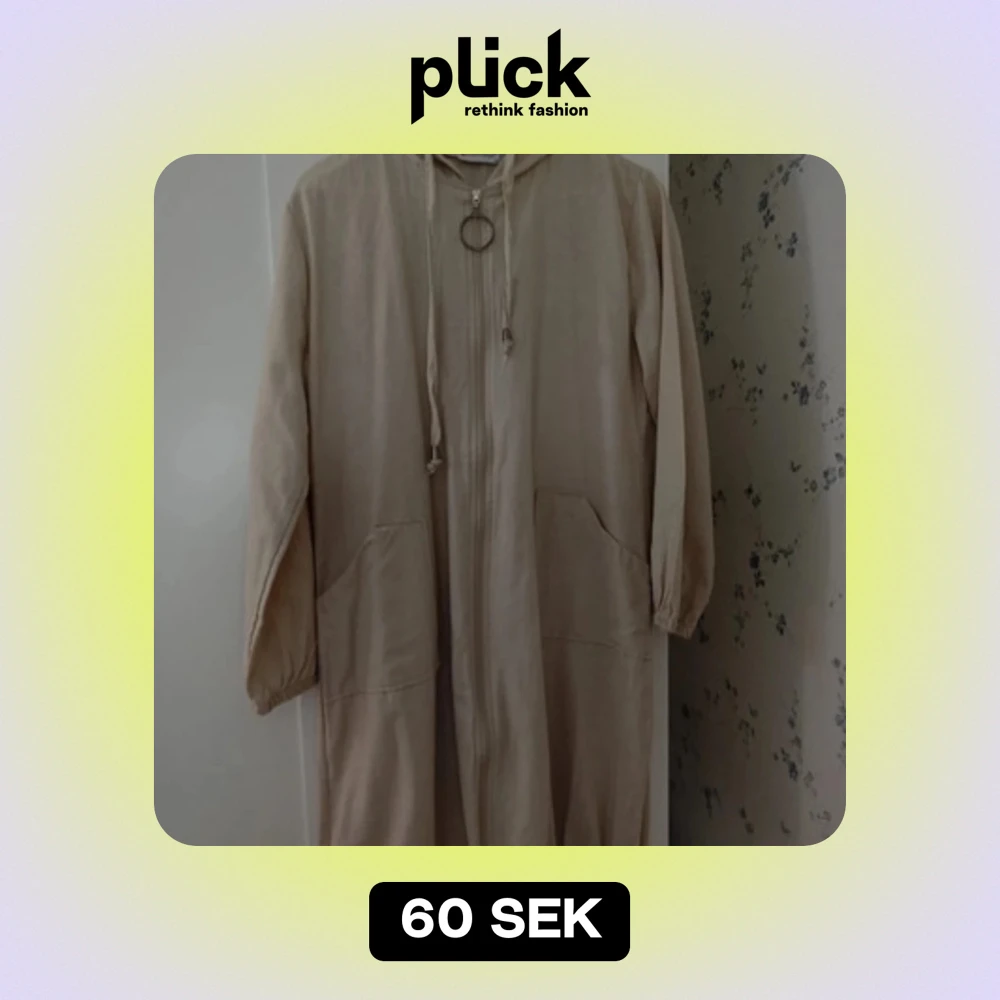 Säljer en beige långärmad kofta från Tesettür Dünyası i storlek 44. Koftan har en dragkedja framtill och en huva, vilket ger en avslappnad look. Perfekt för höst och vår!