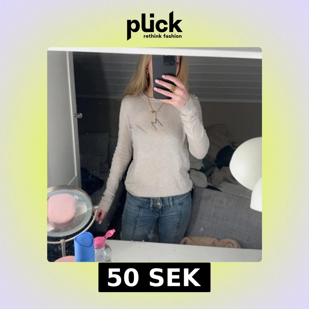 En tunn långärmad stickad tröja som är beige bra skick dock en lite smink fläck vid hals rämmen som inte syns np jätte tydligt.