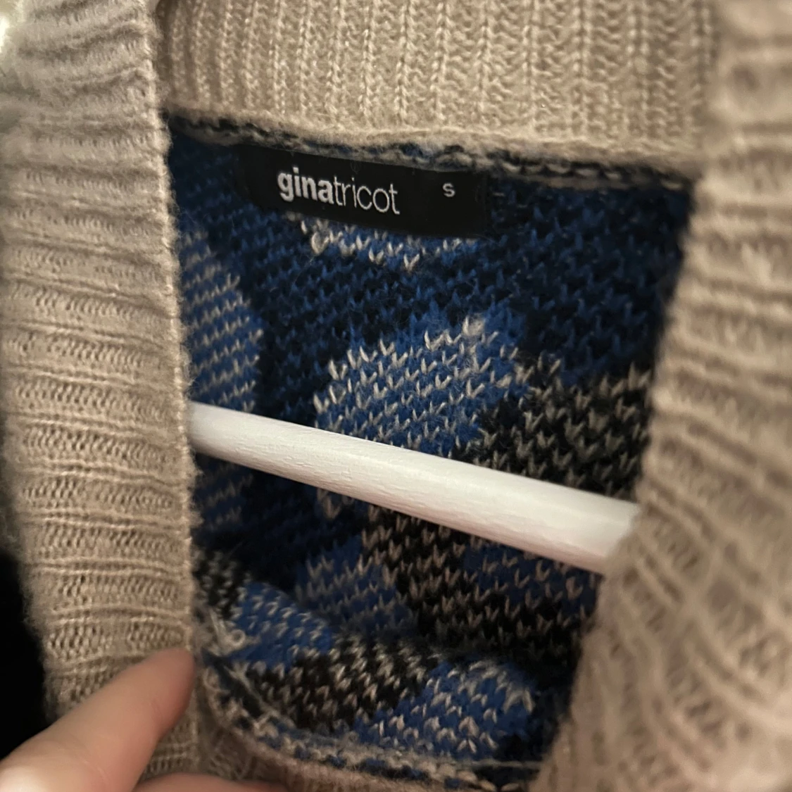 Säljer en snygg beige tröja från Gina Tricot med ett djärvt leopardmönster i svart och blått. Tröjan har en hög krage och långa ärmar, perfekt för att hålla sig varm och stilren. Passar utmärkt för höst och vinter.