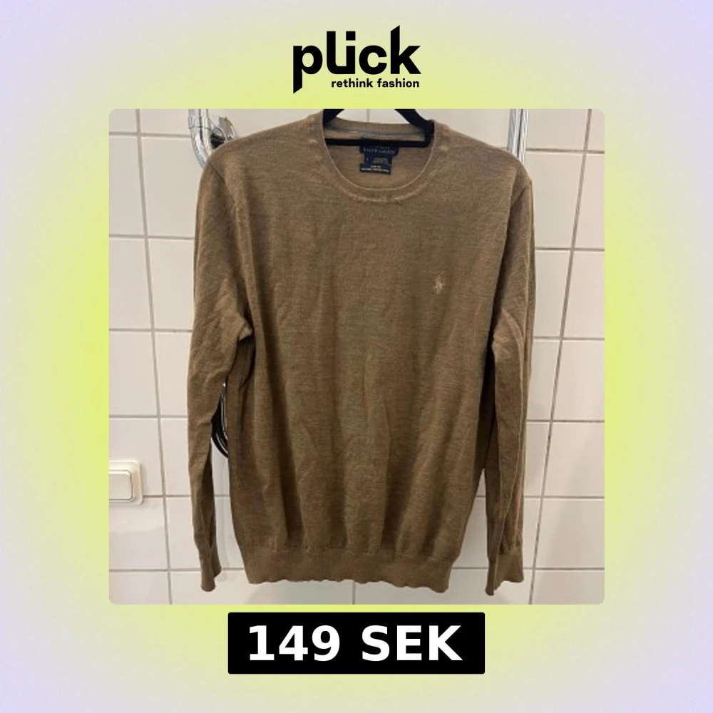 Slim fit beige tröja från Polo Ralph Lauren i mjuk merinoull. Klassisk rund halsringning och diskret broderad logga på bröstet. Har ett riv på armen därav säljer jag den billigt. Storlek M men skulle föredra för S. | Pris 149kr |