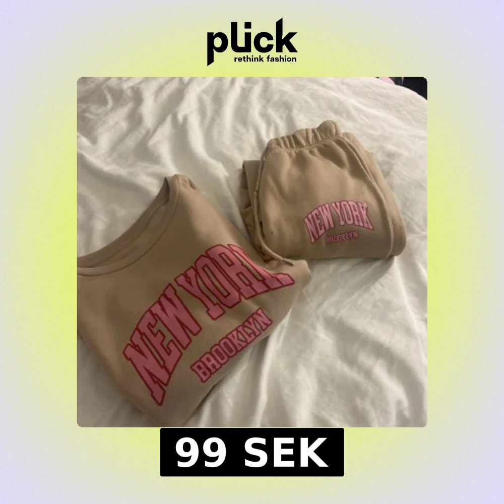 Beige mjukis set från Shein i storlek M med tryck i rosa och rött där det står 'New York Brooklyn' på bröstet. Tröjan har långa ärmar och rund hals. Materialet är mjuk polyester, perfekt för chill dagar och streetstyle.
