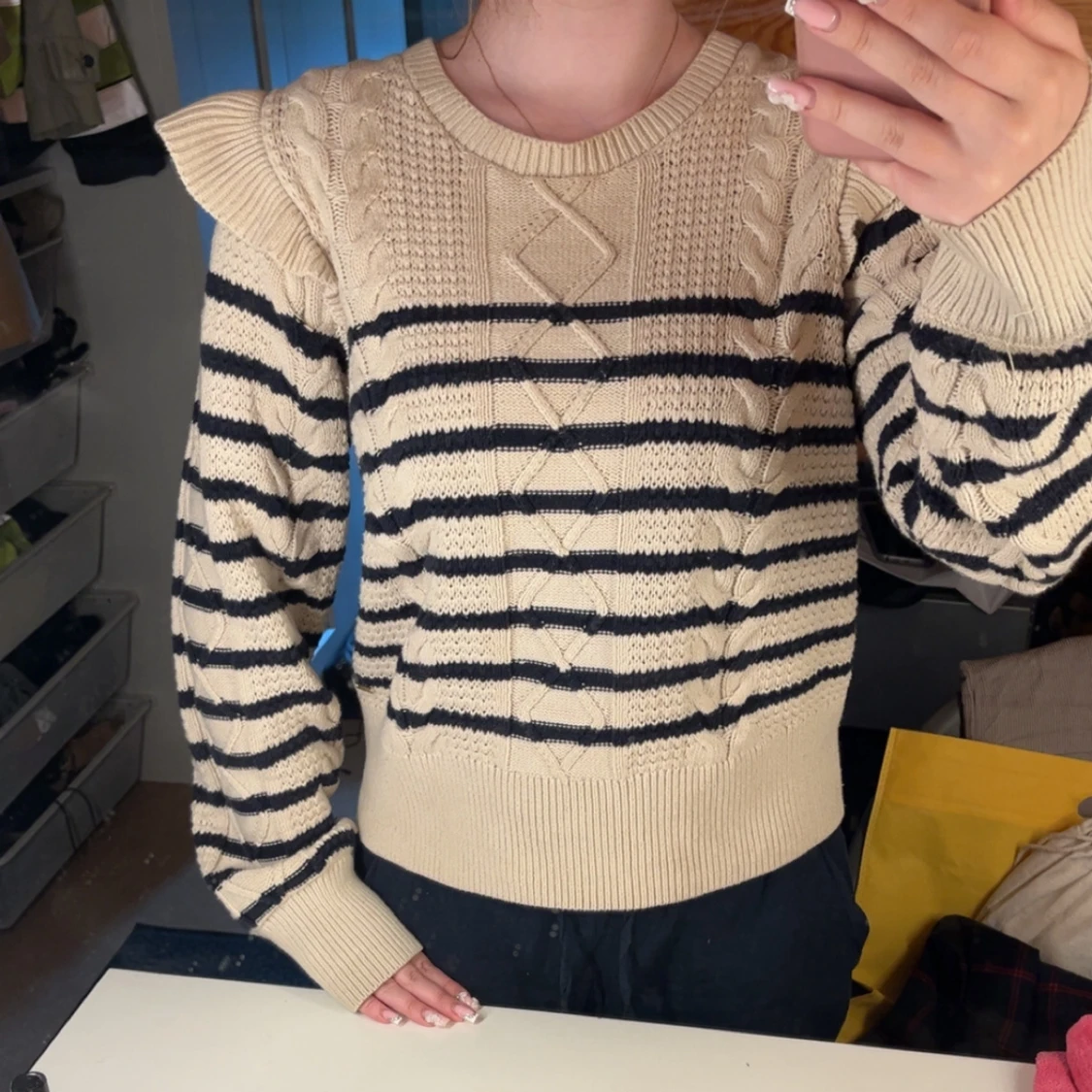 Superfin stickad tröja i beige med svarta ränder och snygga kabelstickade detaljer framtill. Tröjan har volang vid axlarna och långa ärmar med breda muddar. Perfekt för dig som gillar en trendig och mysig look.