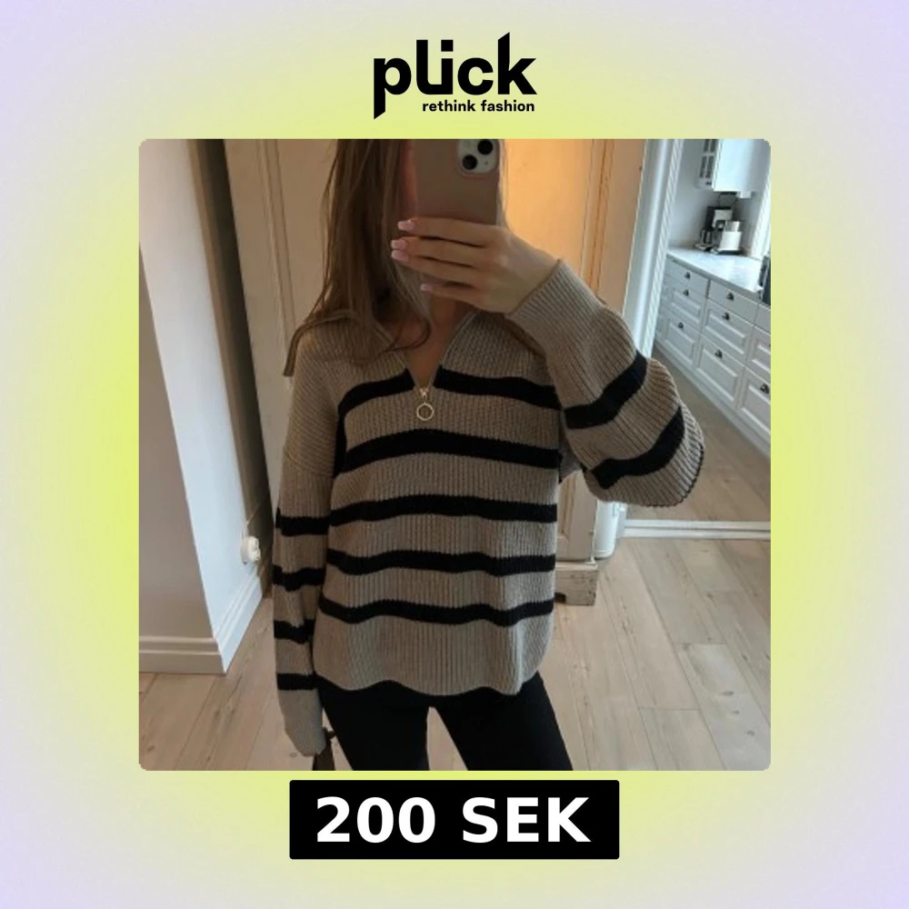 Säljer en mysig beige stickad tröja med svarta ränder. Tröjan har en dragkedja framtill och långa ärmar! Tröjan är i nyskick!💕💕