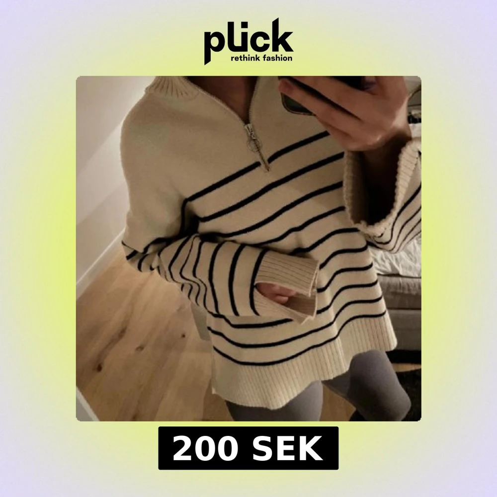 Säljer en mysig beige tröja med svarta ränder och dragkedja vid halsen. Tröjan har långa ärmar och ribbade muddar. Perfekt för en avslappnad stil.