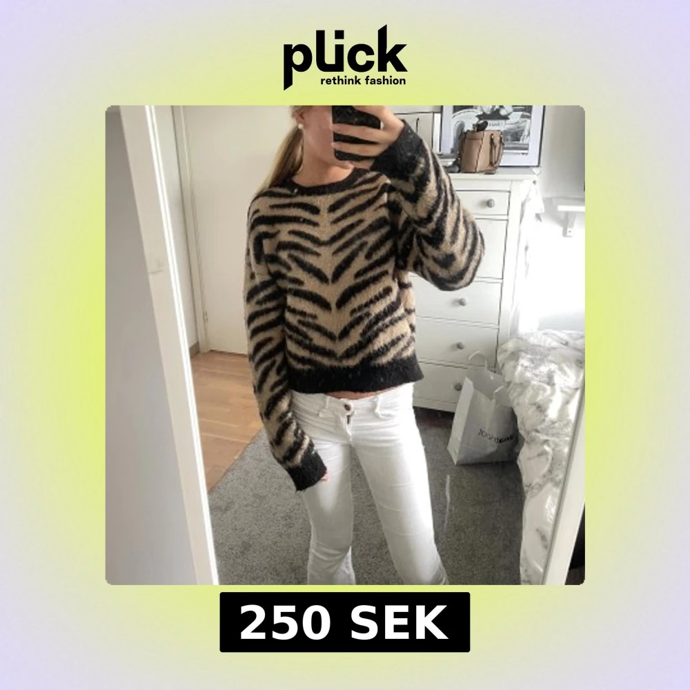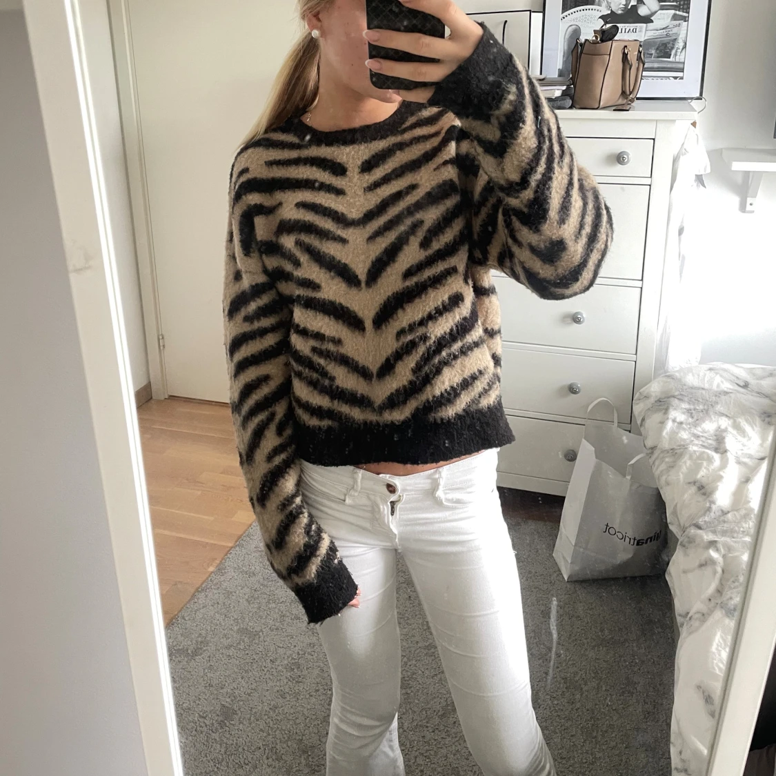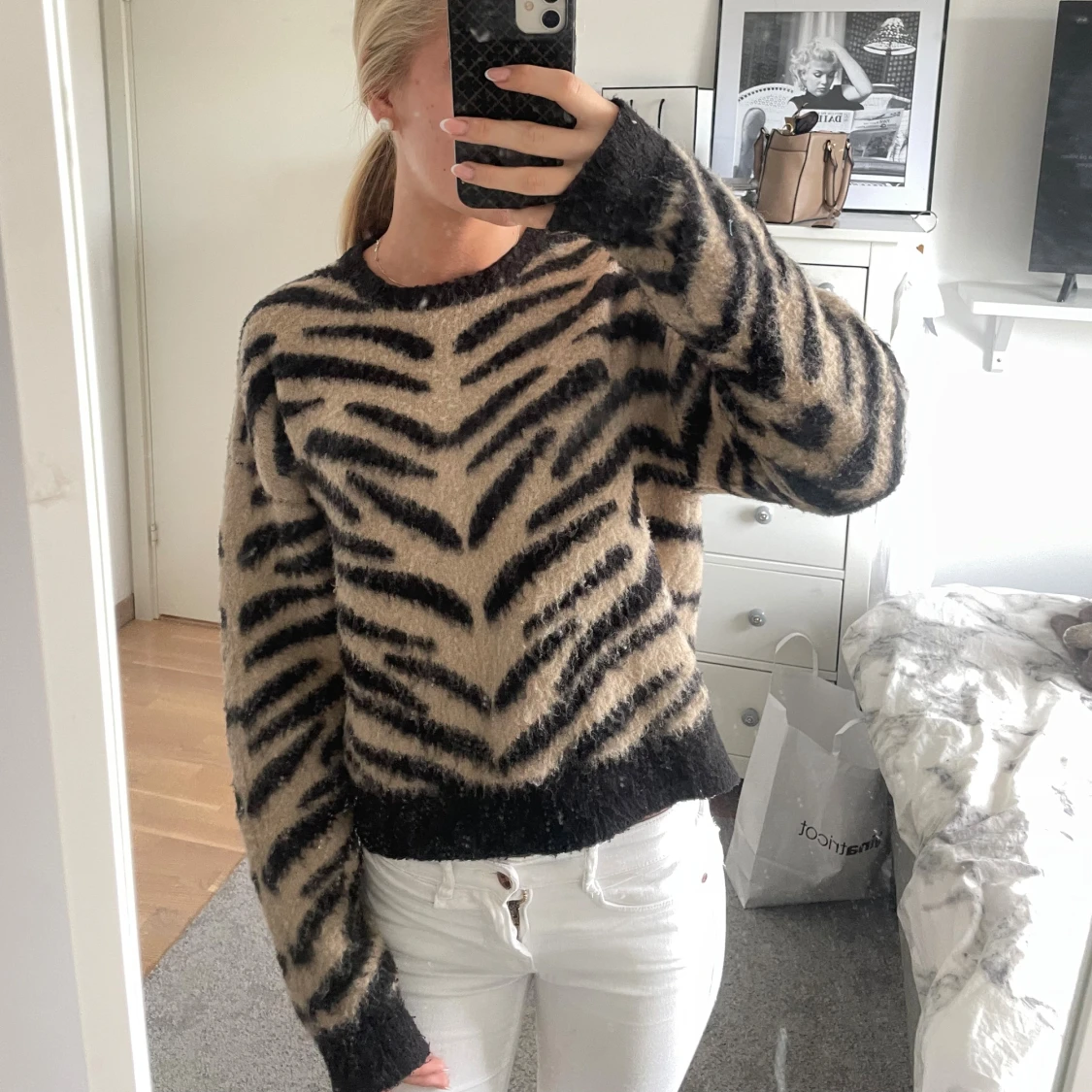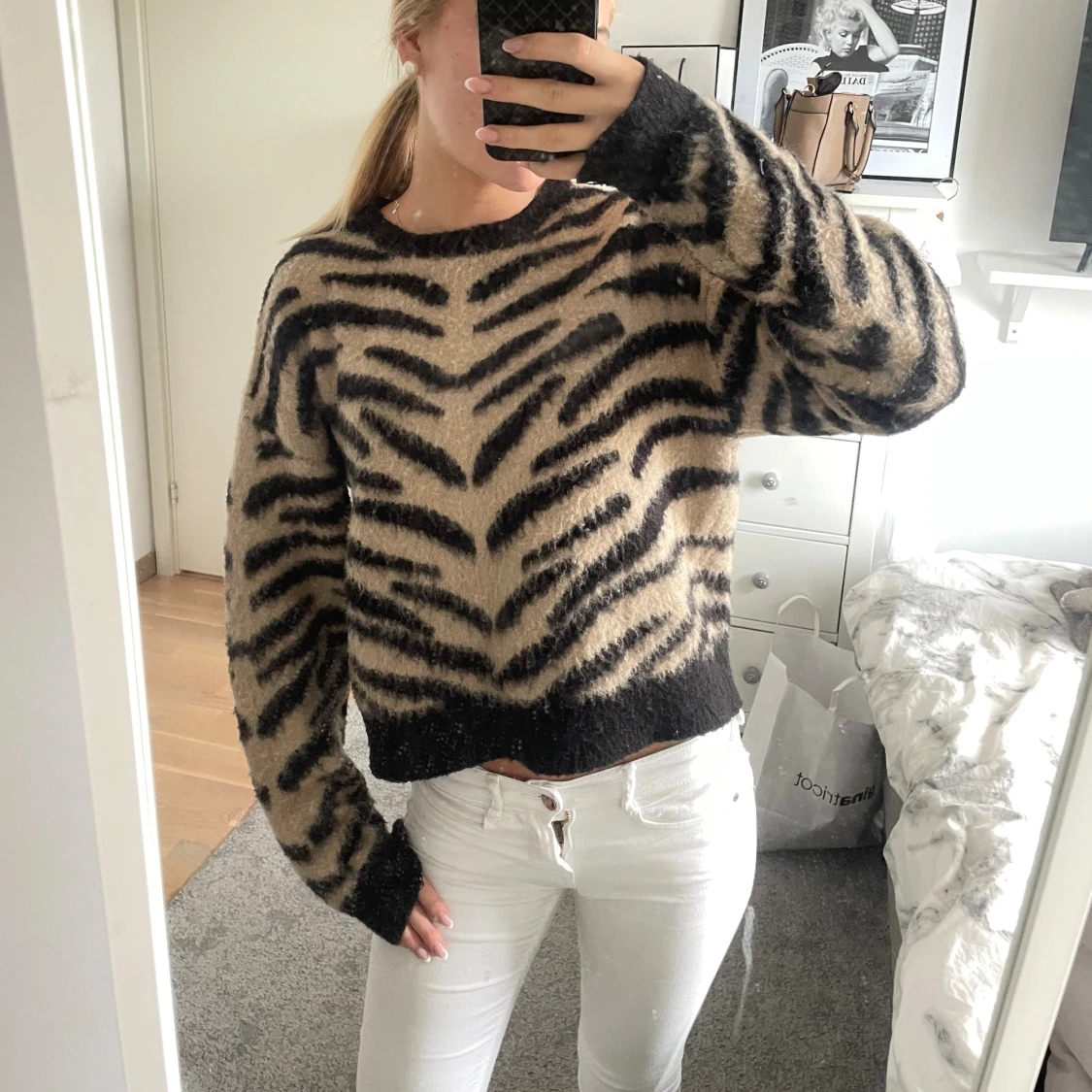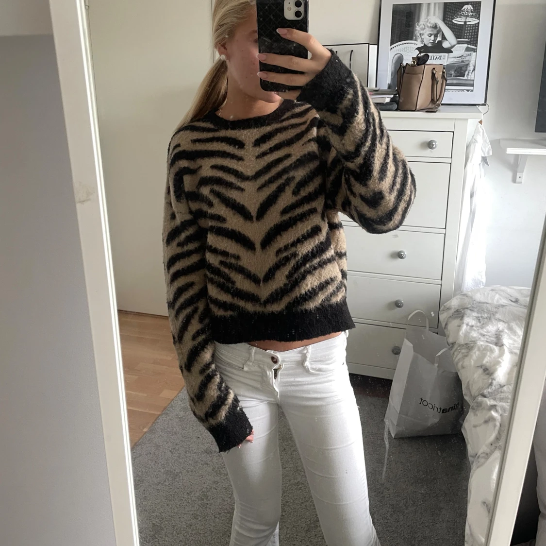 Säljer en fluffig stickad tröja i beige med svart zebramönster. Tröjan har rund hals, långa ärmar och en lite loose passform. Perfekt för dig som vill sticka ut med ett djurmönster och ändå hålla det mysigt.