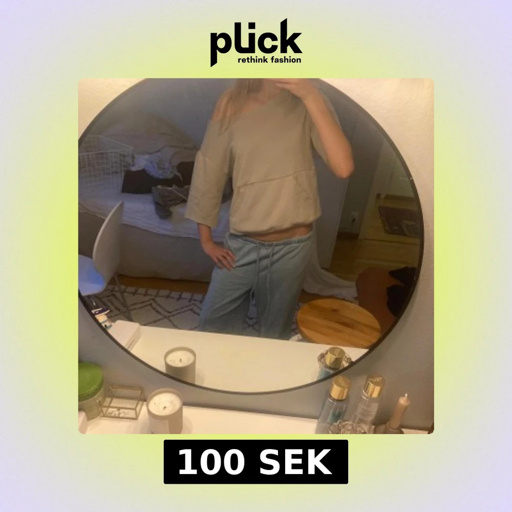 Säljer en beige sweatshirt med offshoulder-design och trekvartsärmar. Tröjan har en avslappnad passform och en stor ficka framtill. Perfekt för en chill och trendig look.