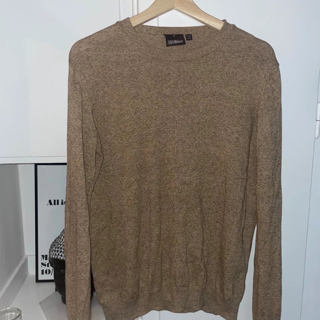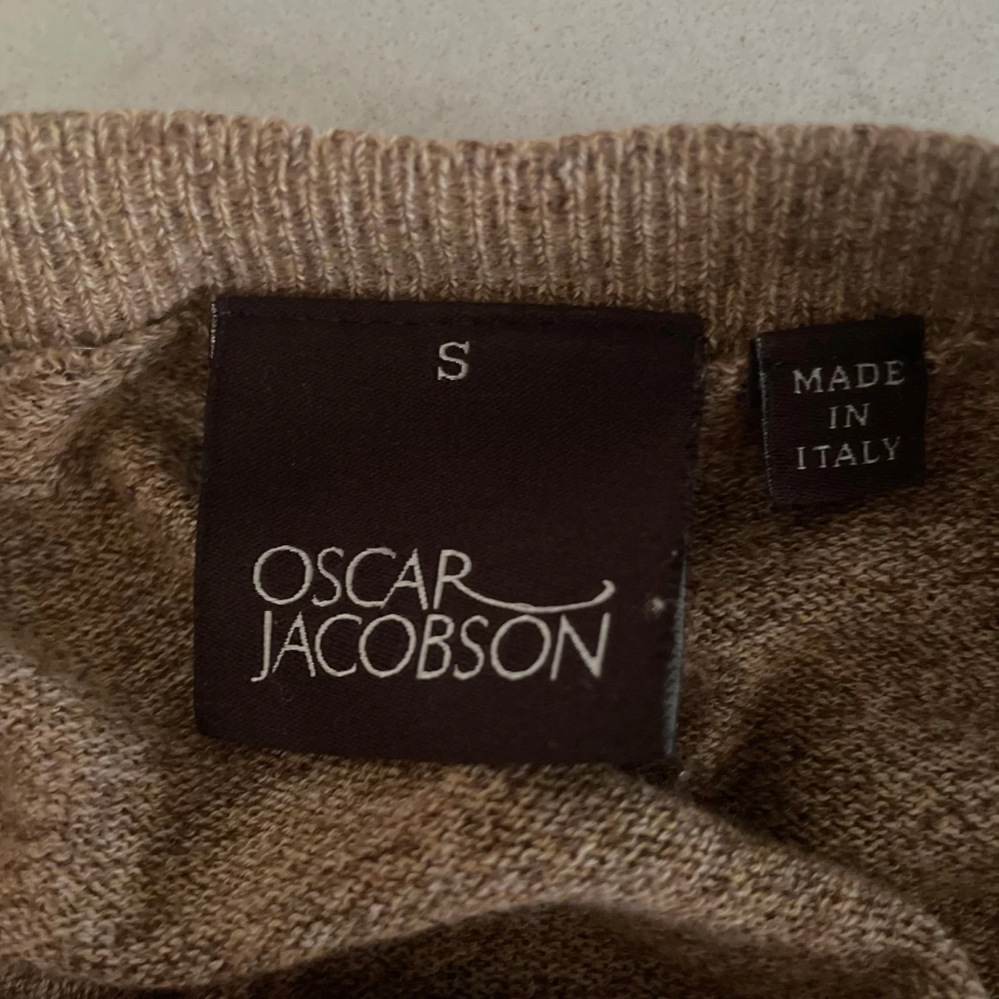Säljer en klassisk beige stickad tröja från Oscar Jacobson. Tröjan har rund halsringning, lång ärm och är tillverkad i Italien. Perfekt för lager-på-lager och snygg till både jeans och chinos. Passar best om du e 176-187