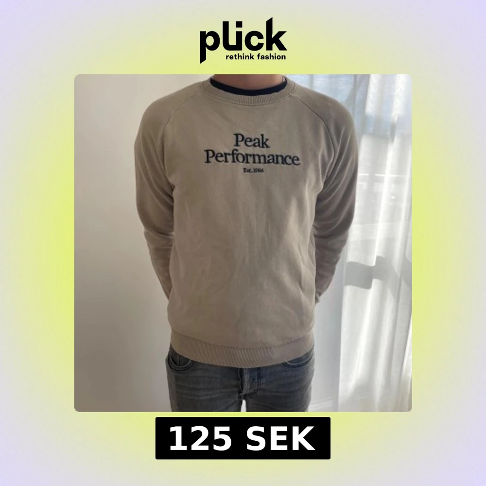Snygg beige sweatshirt från Peak Performance med svart broderad logga på bröstet. Tröjan har rund hals.