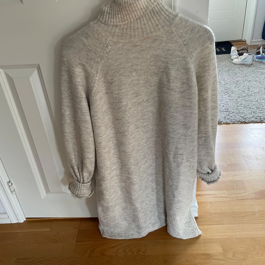 Mysig beige polotröja i stickat material med lång ärm och bred ribbad mudd vid hals, ärmslut och nederkant. Tröjan har en loose passform och är perfekt för lager-på-lager-stil under kyliga dagar.