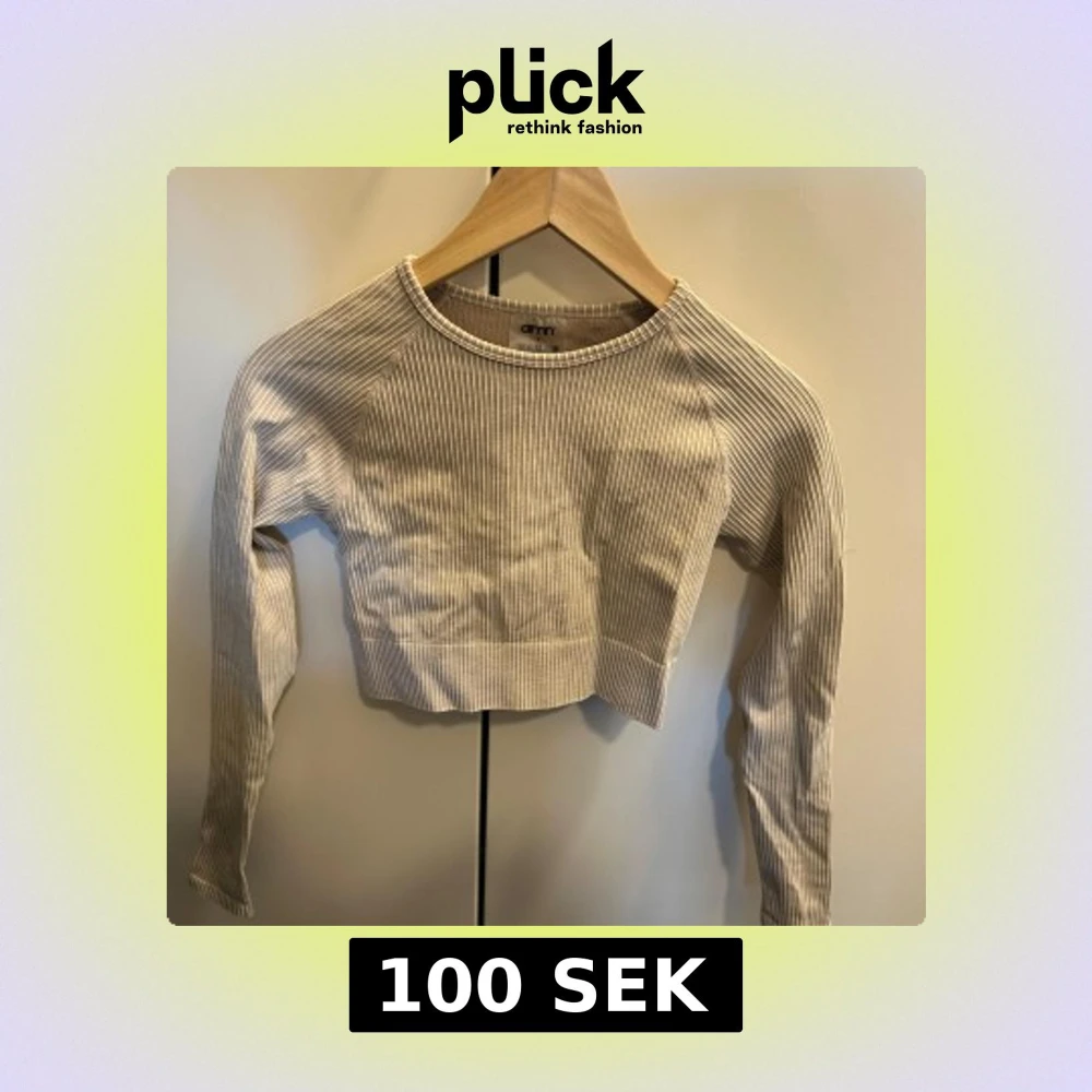 Säljer en beige ribbad croppad långärmad topp från Aim'n. Toppen har rund halsringning och är tillverkad i ett stretchigt material med diskreta ränder. Perfekt för en trendig och avslappnad stil.