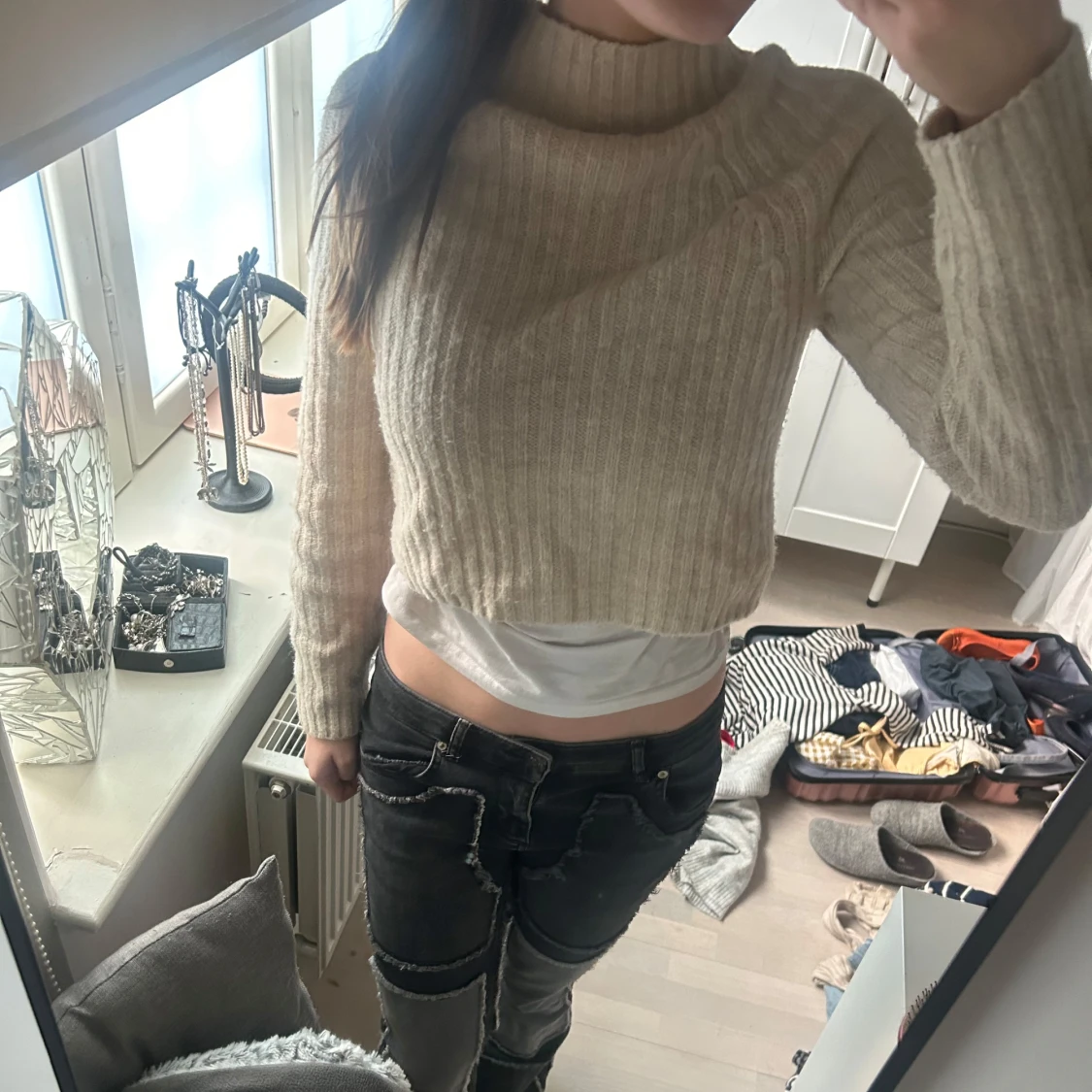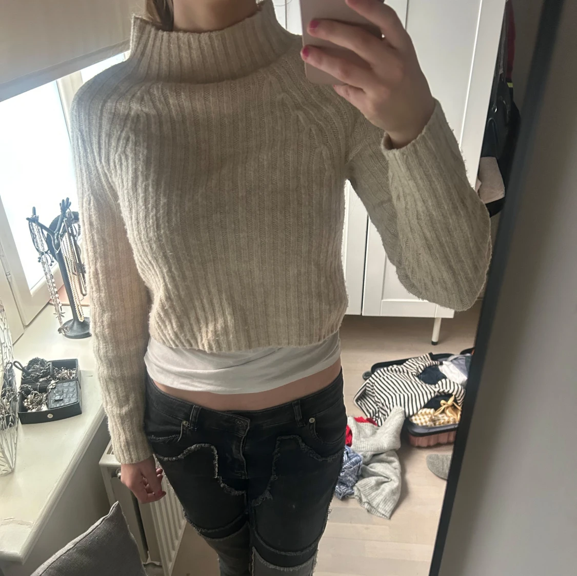 Säljer en beige, ribbad och croppad stickad tröja med hög krage. Tröjan har långa ärmar och är perfekt för lager-på-lager-stil. Enkel och stilren design som passar till mycket.