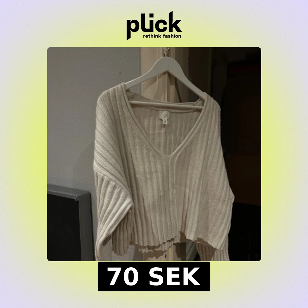 Supermysig beige stickad tröja från H&M med breda ribbor och v-ringning. Modellen är croppad med långa ärmar och har en avslappnad passform. Perfekt att slänga på sig över ett linne eller t-shirt.
