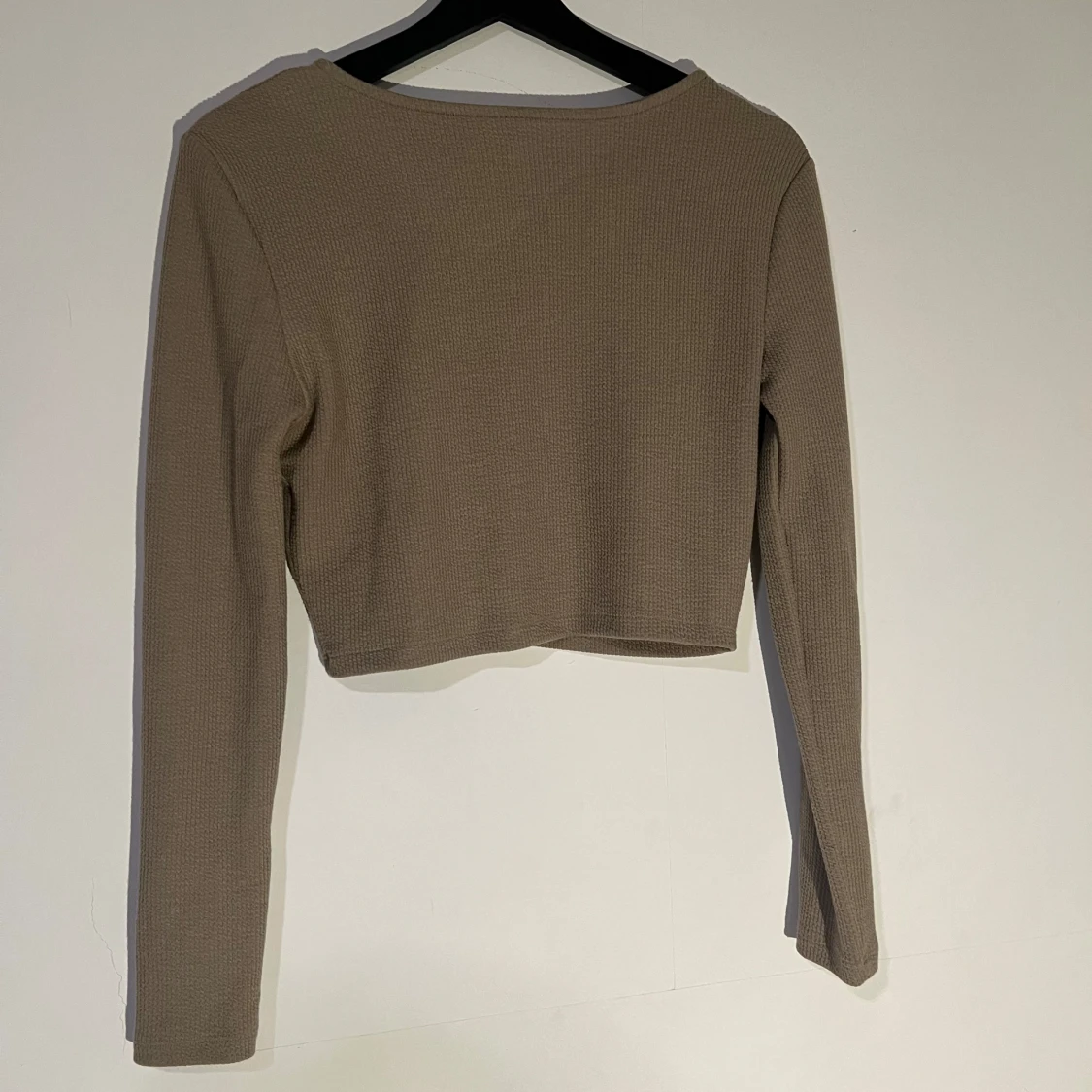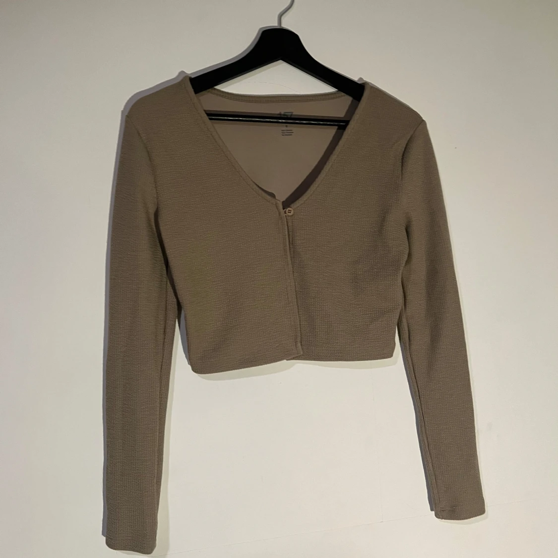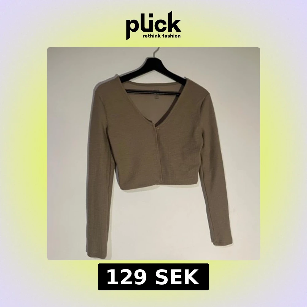 Säljer en stilren beige ribbad kofta med v-ringning och knapp framtill. Den är croppad och har långa ärmar, perfekt för lager på lager-stil. Har använts endast 1 gång.