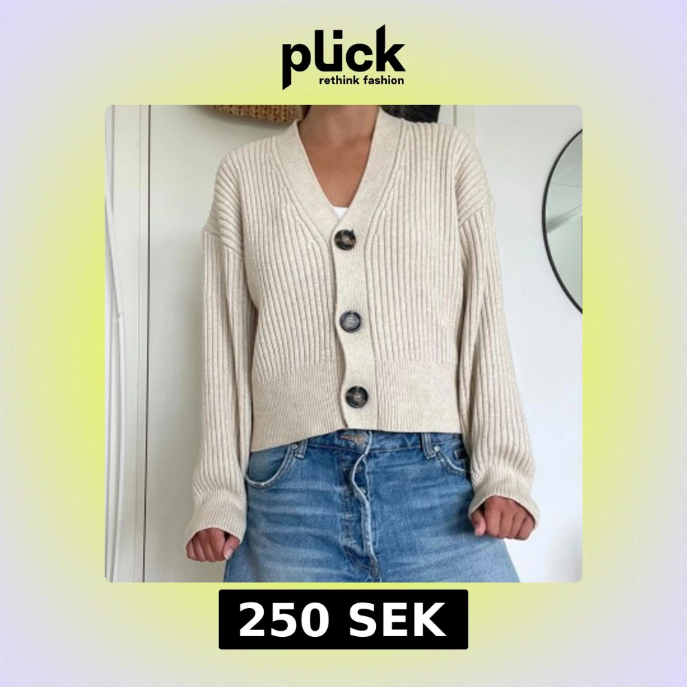 Säljer en beige ribbad kofta från H&M med stora svarta och bruna knappar framtill. Koftan har v-ringad hals, långärmade ärmar. Perfekt för höst och vintern