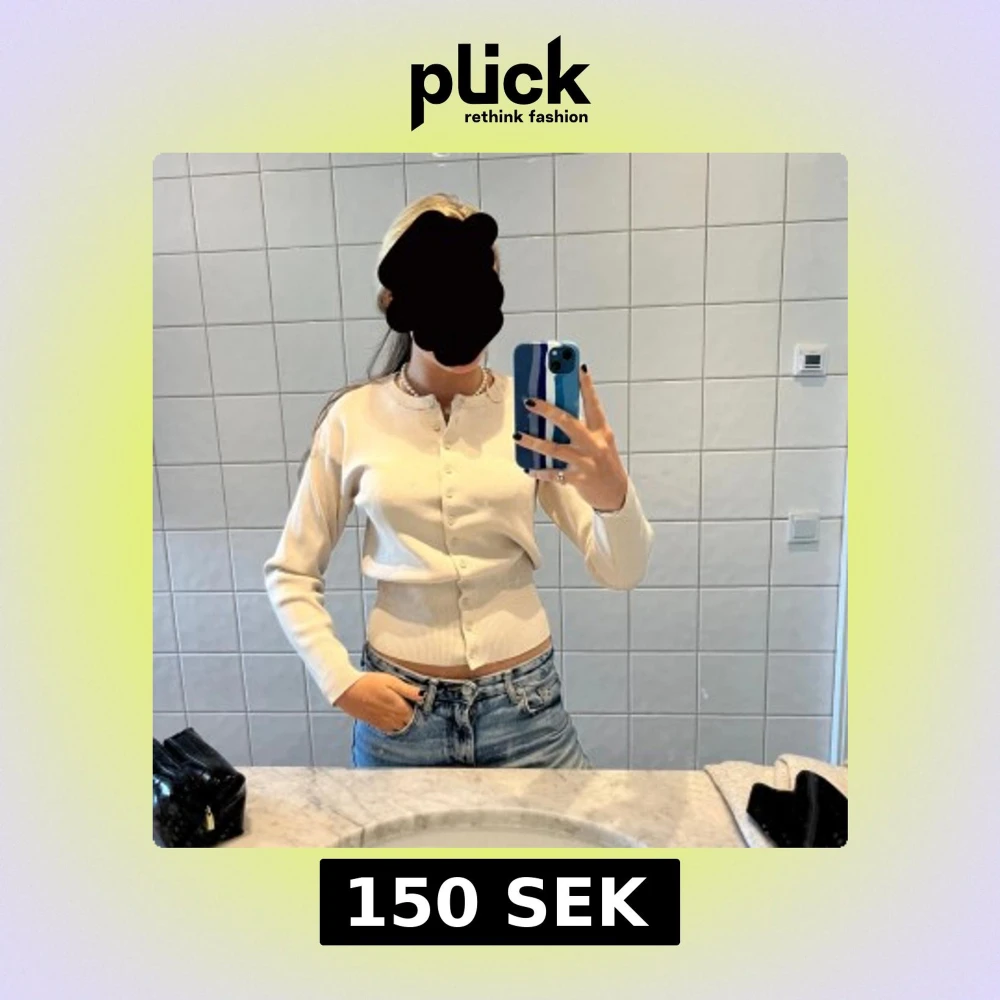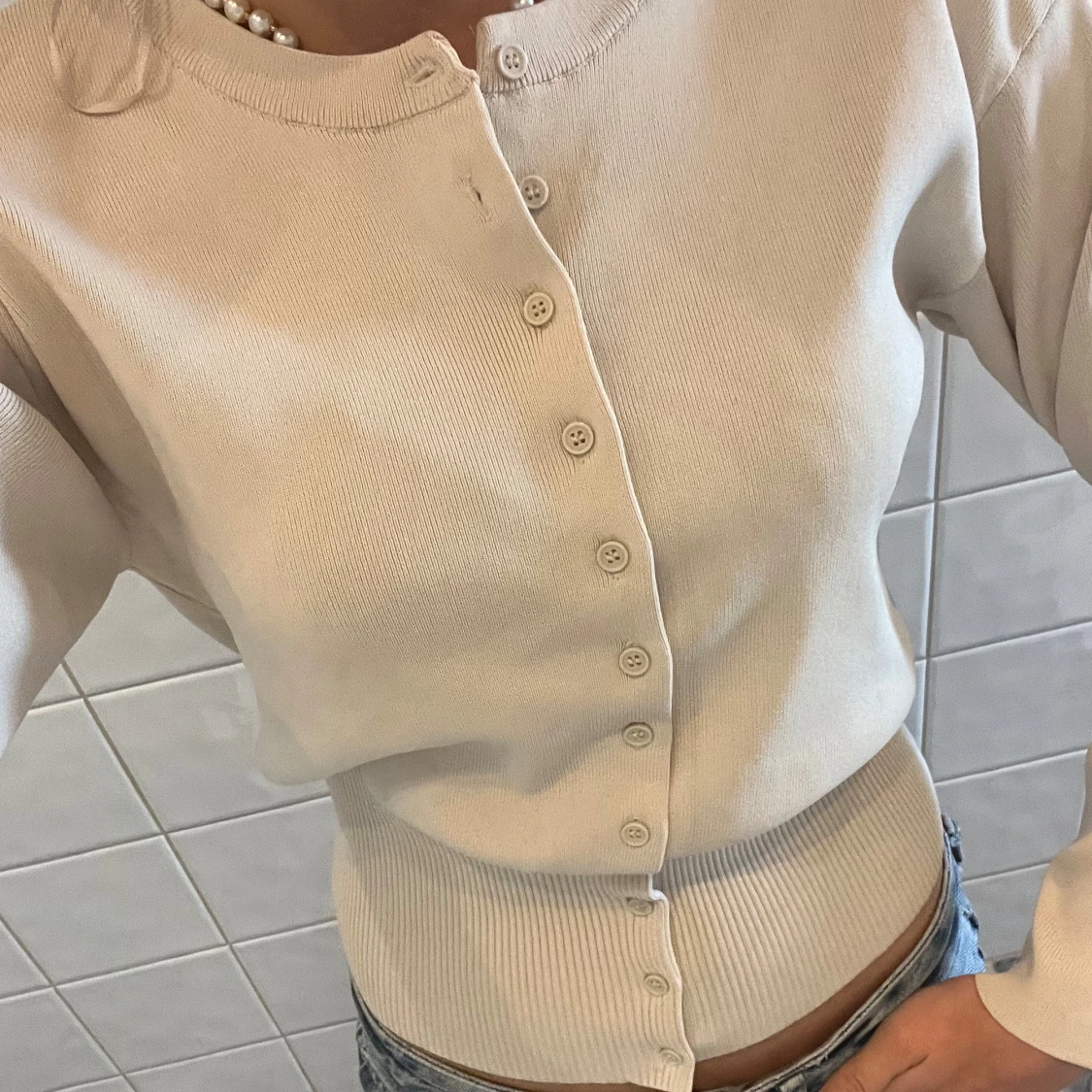 Säljer en beige ribbad kofta med rund hals och knäppning framtill. Tröjan har långa ärmar och sitter tajt i midjan.