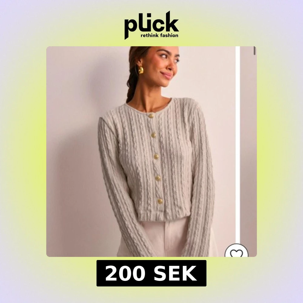 Säljer en stilren beige kofta med ribbad struktur och dekorativa knappar i guld. Koftan har en croppad passform och långa ärmar, perfekt för lager på lager-stil. Ett mångsidigt plagg för både vardag och fest. Oanvänd