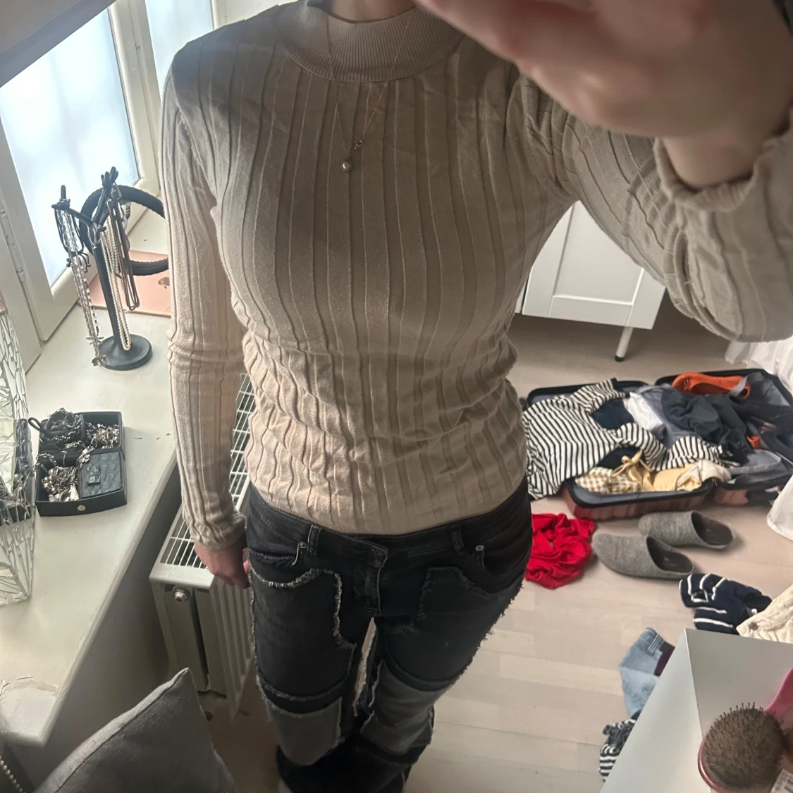 Säljer en beige ribbad långärmad tröja med rund halsringning. Tröjan har en tight passform och är perfekt för lager-på-lager. Enkel och stilren design som passar till mycket.