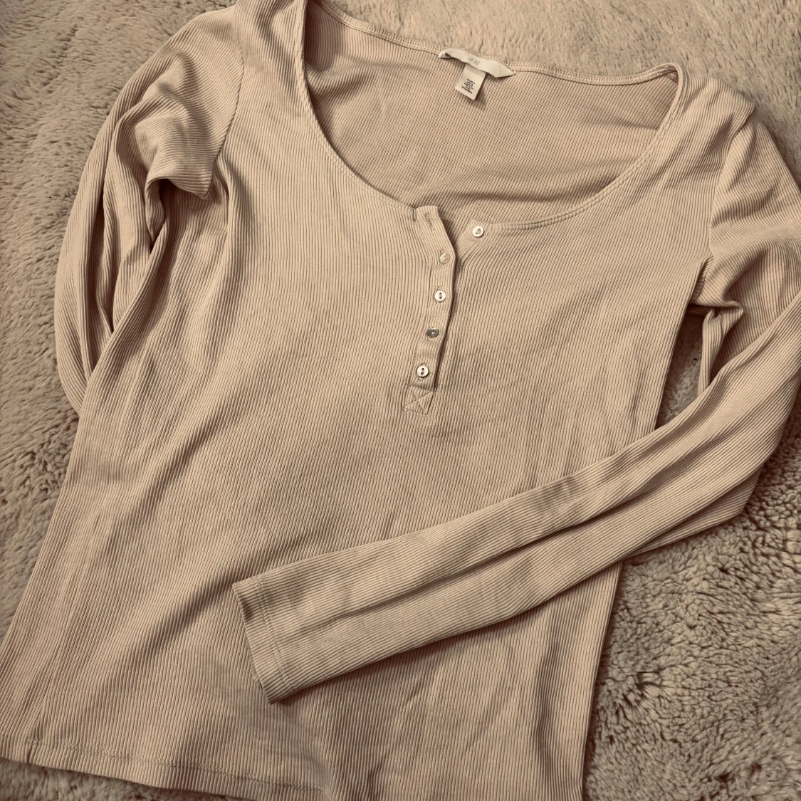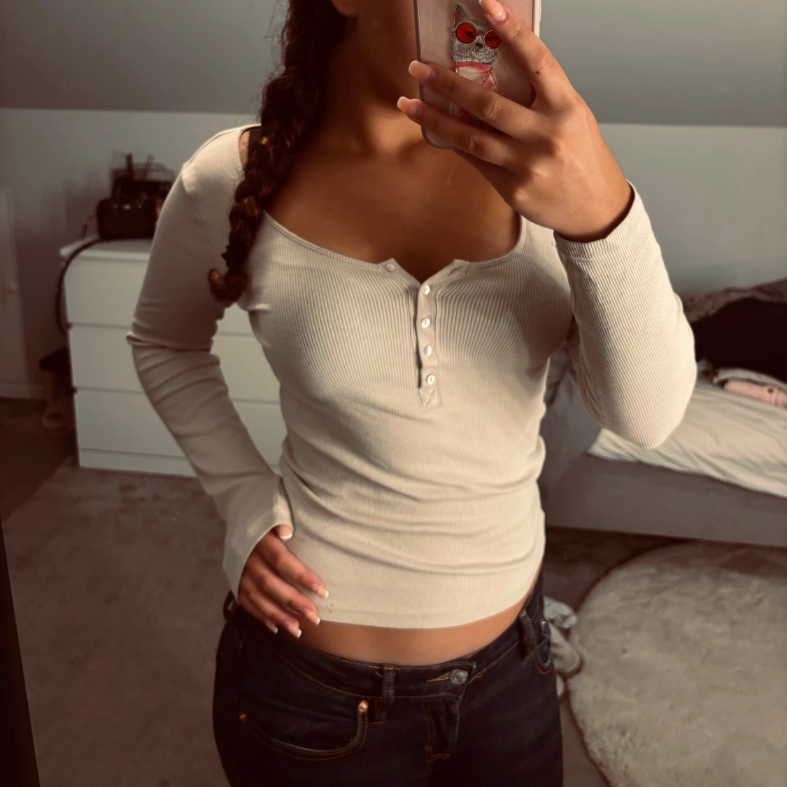 Säljer en beige ribbad långärmad tröja från H&M i storlek S. Tröjan har en snygg v-ringad hals med knappar framtill och är figurnära i passformen. Perfekt att styla med jeans eller kjol för en chill look.